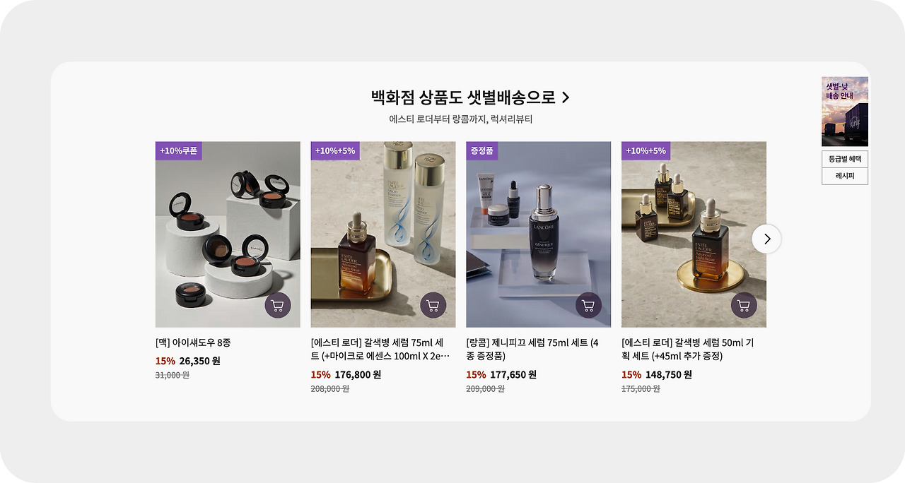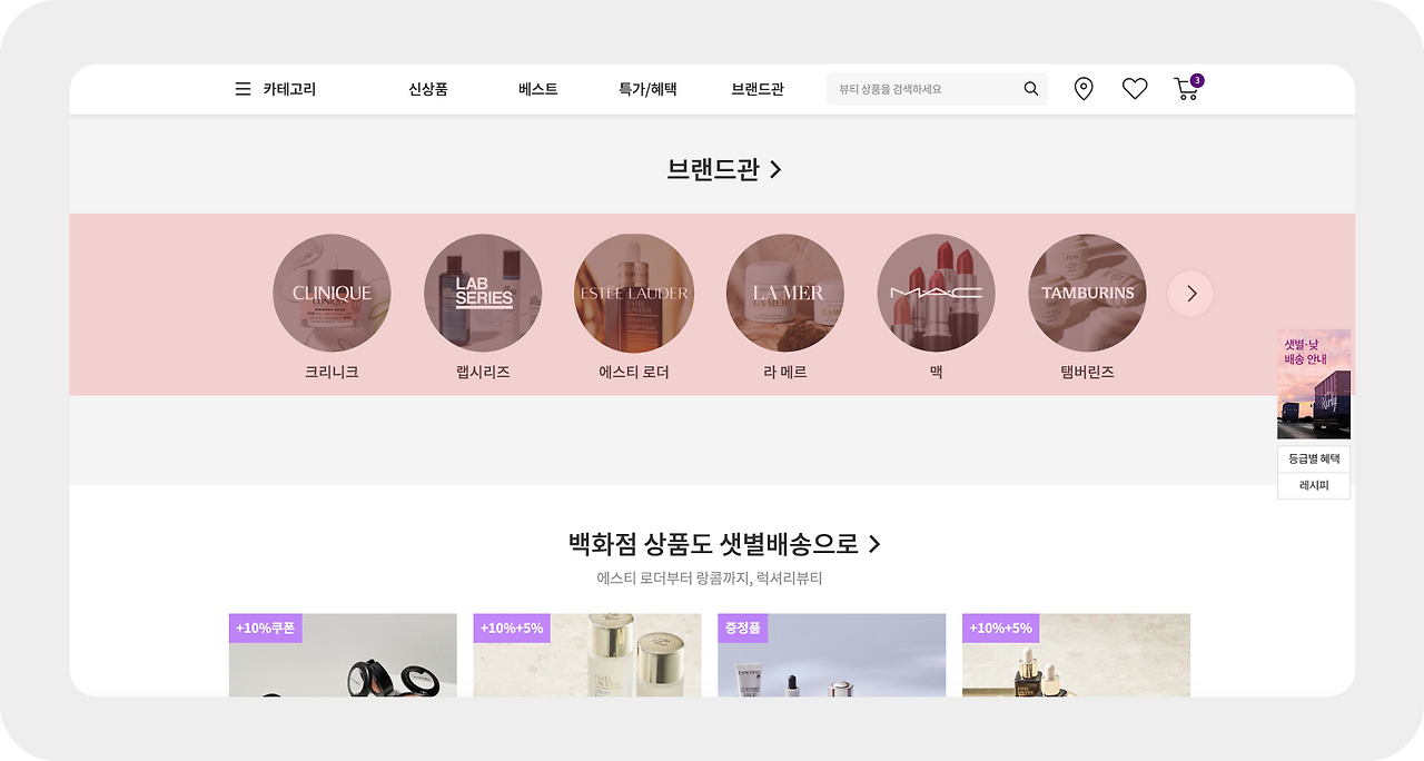 백화점 상품을 온라인으로 받아볼 수 있는 기능이 필요했지? 이 점을 노리듯이 교묘하게 오른쪽 배너에