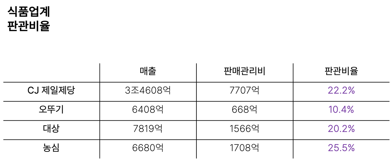 통상 제조업을 둔 식품업계의 판관비율은 20%대를 유지하는걸로 보이는데요.
