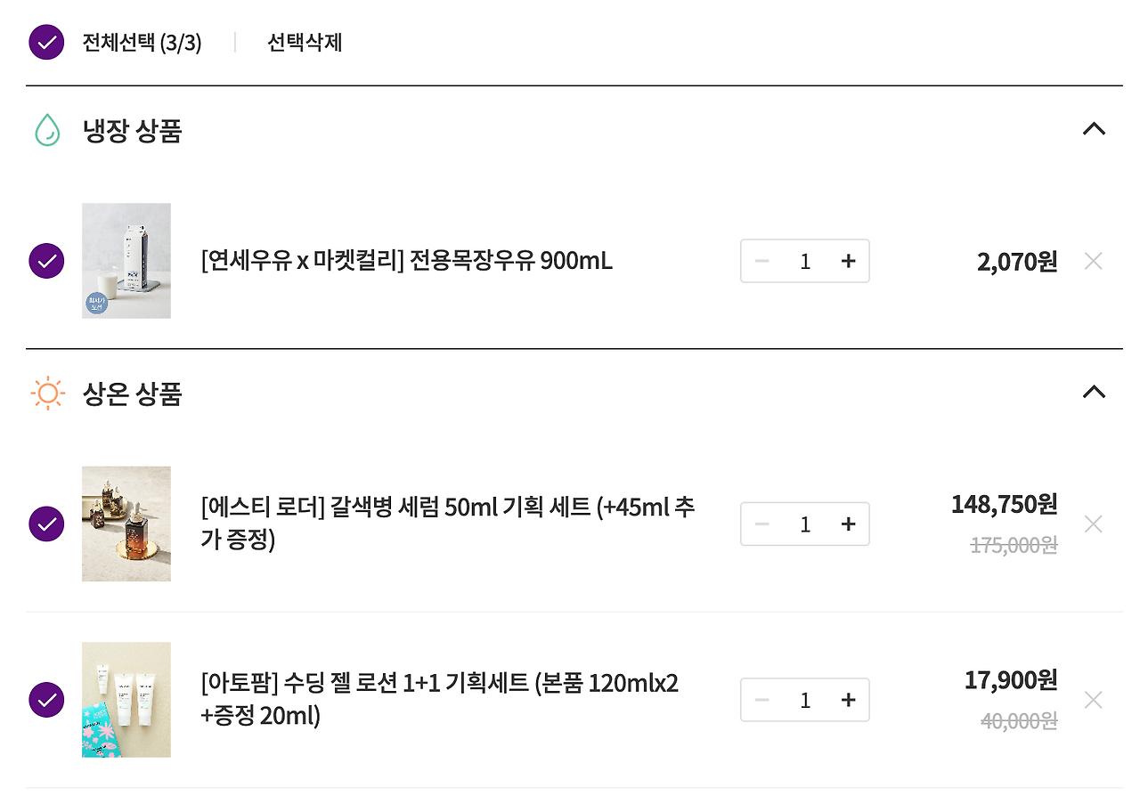 아래와 같이 한개의 장바구니에 담겨 같이 배송되는 시스템입니다.