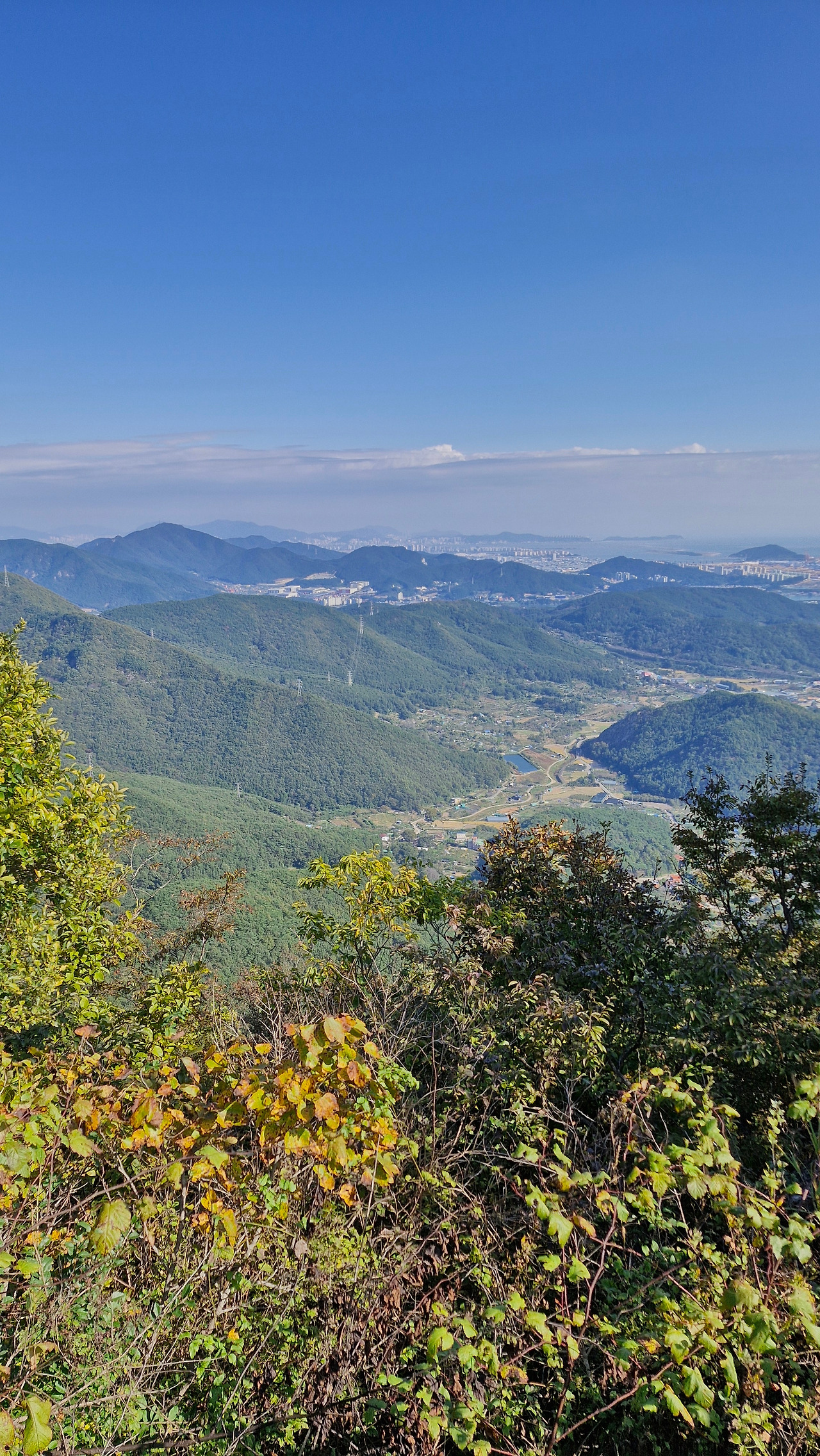 천자봉으로 향하는 마지막 고비 만장대 철쭉 숲 옆 벤치에서 잠깐 멈춰 선다. 정상 표지석을 스치듯 지나 난간에 손을 얹자, 가을이 한 장의 지도처럼 펼쳐진다. 가까이는 단풍의 붉음과 노랑이 층층이 겹쳐 있고, 아래로는 들녘이 마지막 빛을 털어내고 있다. 멀리 아파트 단지들이 촘촘히 늘어서 있고, 도로는 은색 연필로 그은 선 같다. 시선을 더 멀리 밀어내면 드디어 남해 바다가 나타난다. 오늘의 바다는 얌전한 호흡을 반복하며 은빛 비늘을 끝도 없이 반짝인다. 햇살 각도가 바뀔 때마다, 물결은 작은 알전등처럼 켜졌다가 꺼진다. 그 장면은 마치 거대한 자연의 합창처럼 느껴진다. 푸른 하늘과 선명한 지평선 아래, 파도는 조용한 리듬으로 반짝이며 진해만의 너른 풍경을 품고 있었다. 멀리 펼쳐진 산줄기와 골짜기, 마을의 논밭과 도로들이 선명하게 눈에 들어왔다.