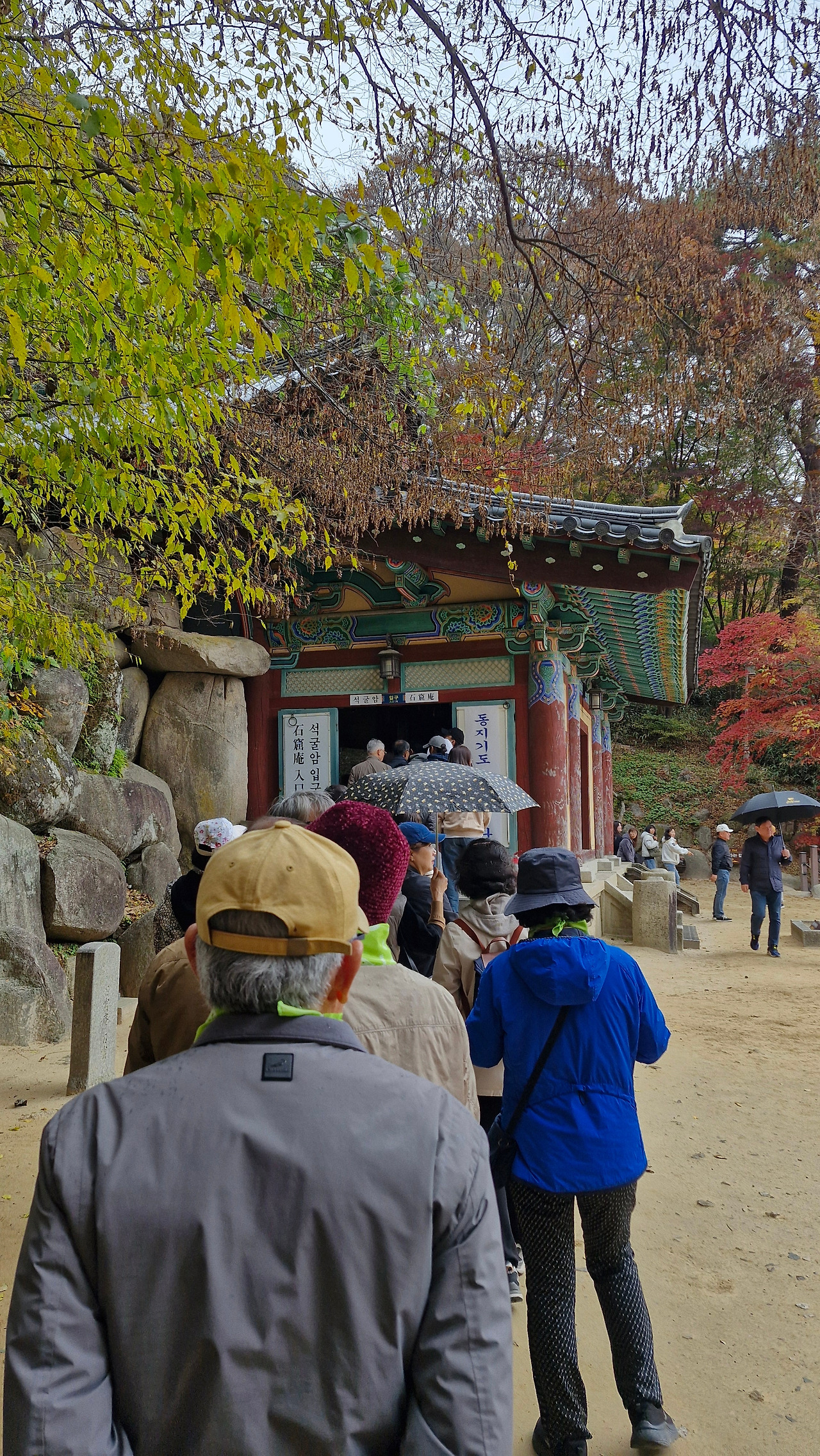 이어서 토함산 길을 올라 석굴암 앞에 줄을 서니 바람이 언어의 가장자리를 걷어 갔다. 곧 원형 주실과 전실의 비례가 중심을 향한 마음의 수렴을 부드럽게 돕는 장치처럼 느껴졌다. 더불어 본존과 권속상의 배열은 교학적 위계를 품고 있었다. 보살·제자·신장들이 앞·옆·뒤에 서고, 높이와 거리, 바라보는 방향을 달리한 그 배치 자체가 불교 교리의 위계와 질서를 눈앞에 드러내는 도상 언어처럼 다가왔다. 그래서 말로 듣는 설명보다 침묵 속에서 더 또렷이 이해되는 순간이었다. 오늘 잠시 스치듯 관람한 시간이었지만, 젊은 시절의 장면과 최근의 분주함이 포개지며 호흡은 다시 일정한 깊이를 되찾을 수 있었다.