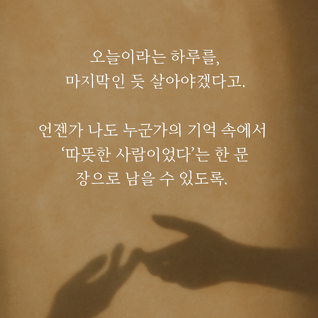 오늘이라는 하루를, 마지막인 듯 살아야겠다고. 언젠가 나도 누군가의 기억 속에서 ‘따뜻한 사람이었다’는 한 문장으로 남을 수 있도록.