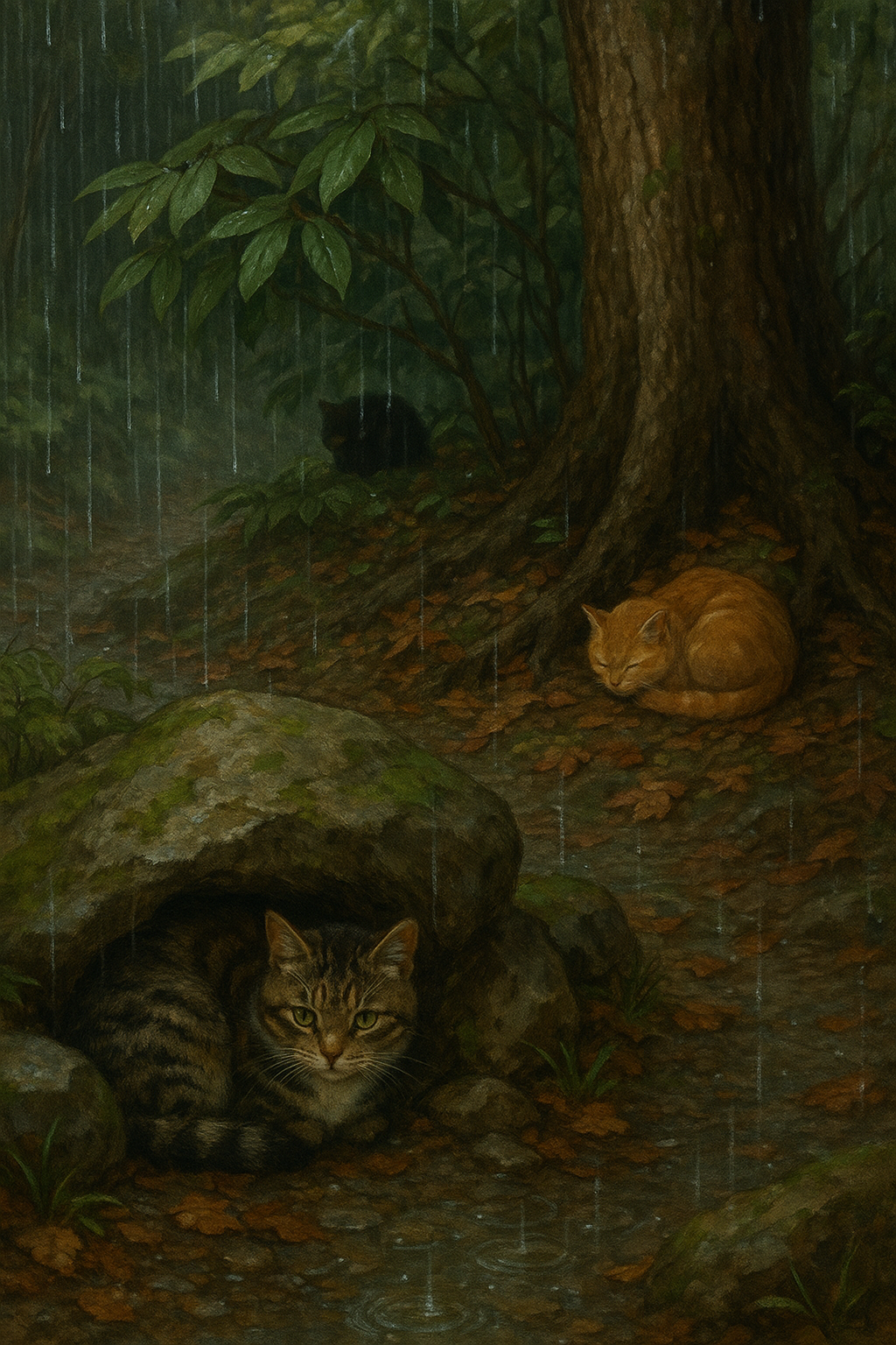 그리고 그때, 우리는 더 이상 비에 젖은 눈빛을 바라보며 안쓰러워하지 않아도 될 것이다. 그 대신, 젖은 숲속에서도 평온한 숨소리를 들을 수 있기를. 나 또한 그 고양이들처럼, 자연 속에서 안심하고 몸을 누일 자리를 찾아갈 수 있기를 바란다.