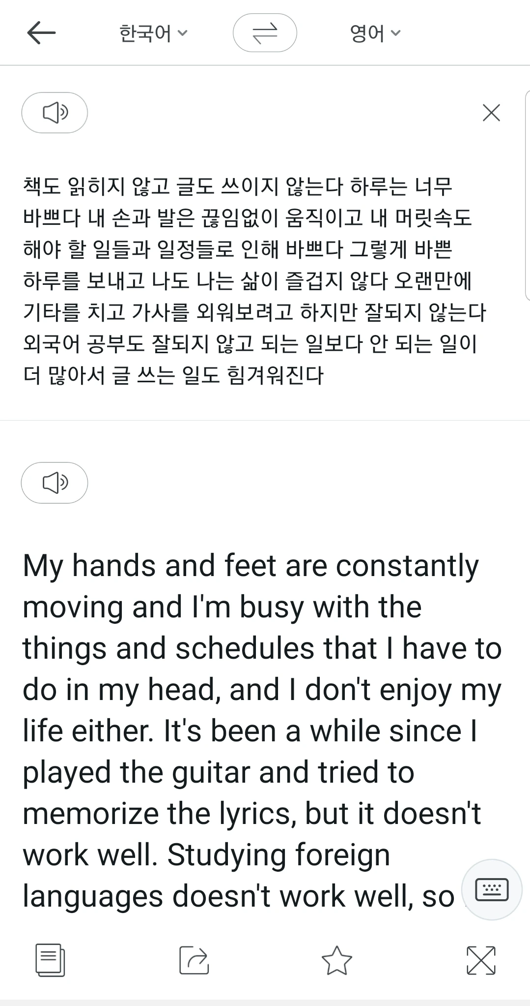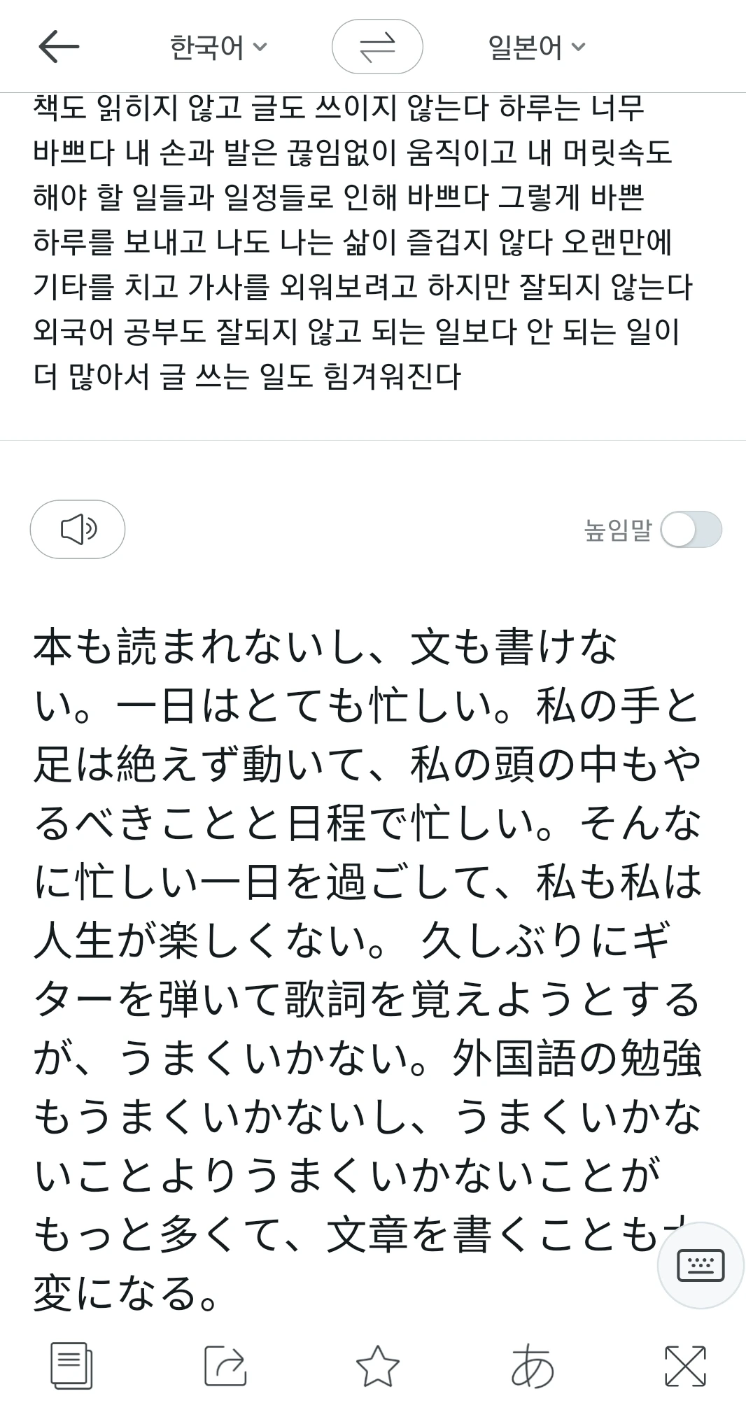 외국어를 배우는 사람에게는 외국어를 조금이라도 배웠다면 파파고를 이용해 한글로 쓴 나의 일기를 외국어로 변환해서 내가 생각하는 문장과 파파고의 문장이 맞는지 검토하면서 외국어도 배우고 일기도 쓰는 일석이조의 효과를 거둘 수도 있을 것 같다. 한국식 외국어이긴 하겠지만 원어민의 문장을 익히는 것은 좋은 작가의 문장을 필사하면서 자신의 문장을 만들어야 한다. 자신이 좋아하는 것을 많이 읽고 많이 쓰다 보면 외국어는 어느덧 자신의 문장이 된다.