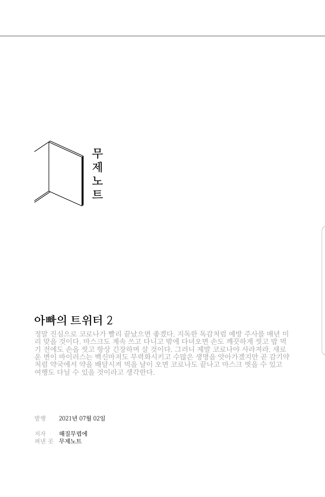 아직 코로나가 끝나지 않았다. 하지만 코로나를 물리치려고 노력했던 모든 사람들의 땀과 눈물이 헛되지 않았다는 것을 우리는 알고 있다. 그래서 더 마음이 아프다. 조금만 더 참고 조금만 더 참고 노력했다는 것을 알지만 더 참을 수 없을 정도로 많이 힘들었다는 것과 이제는 코로나와 함께 가야 할 수밖에 없는 상황에 처해 있다는 것도 알고 있다. 앞으로의 일상이 어떻게 기록될지 모르겠지만 세상은 우리가 긍정적으로 쓰면 긍정적으로 움직인다는 것을 안다. 나 혼자 쓰면 조금 더딜지는 모르겠지만 같이 쓰고 읽으면 그것이 현실이 된다는 것을 우리는 안다. 나는 이런 글을 쓰지만 다른 사람들은 나보다 더 뛰어나고 멋진 글을 쓸 수 있다는 것을 많은 사람들이 보여 주었으면 좋겠다. 우리 지호, 리호도 분명 그럴 수 있을 것이라고 생각해. 사랑해. 우리 나중에 다시 읽어도 눈물 흘리지 않고 아빠의 글들을 읽을 수 있을 거라고 생각해.