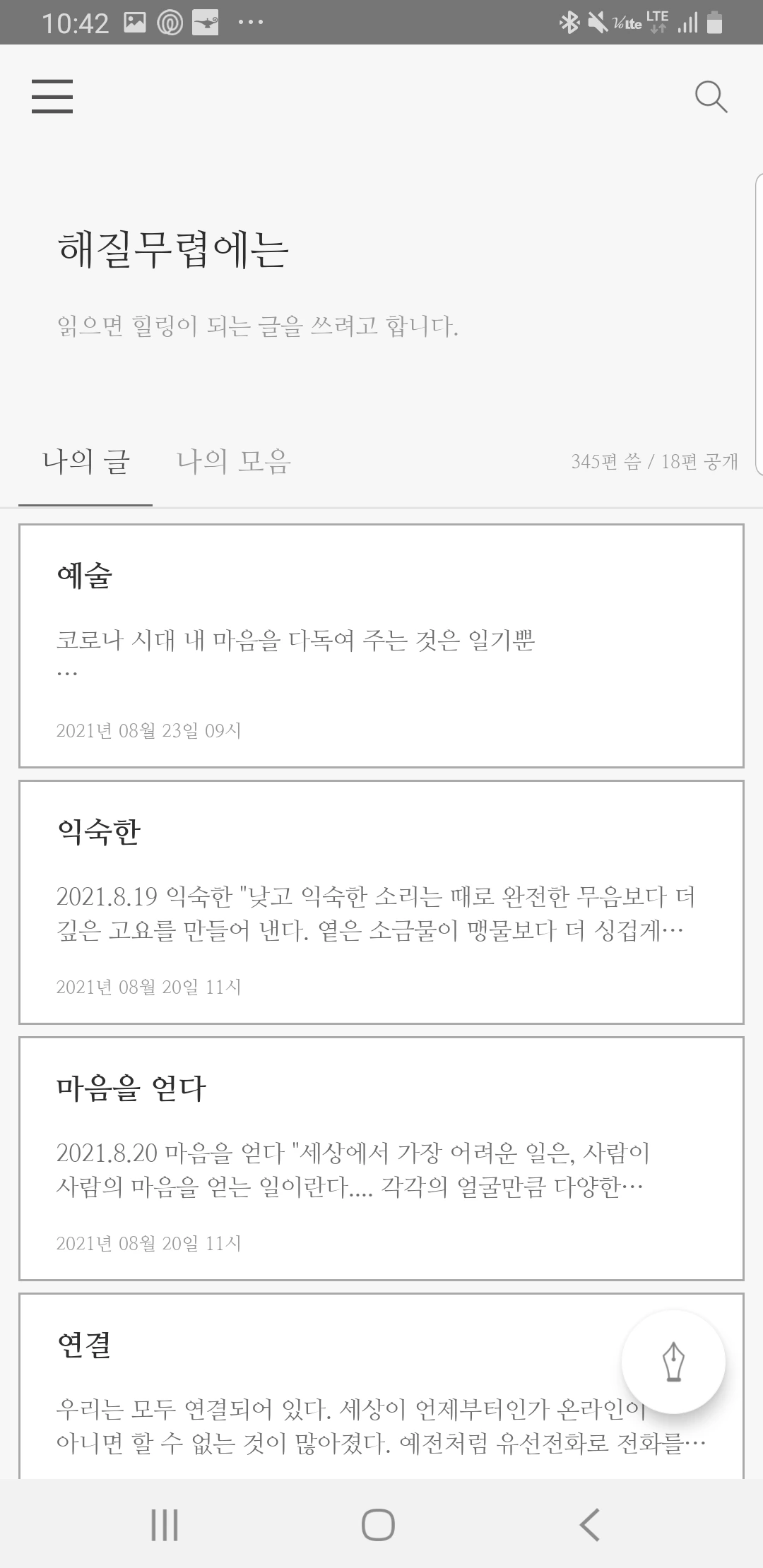 글을 쓴다는 것은 나 자신과의 간접적인 대화이고 치유이다. 살면서 매일 한 페이지가 아니라도 단 세 문장이라도 글을 쓰는 습관을 가졌으면 좋을 것 같다. 그래서 이 글을 쓰고 있는지 모르겠다.