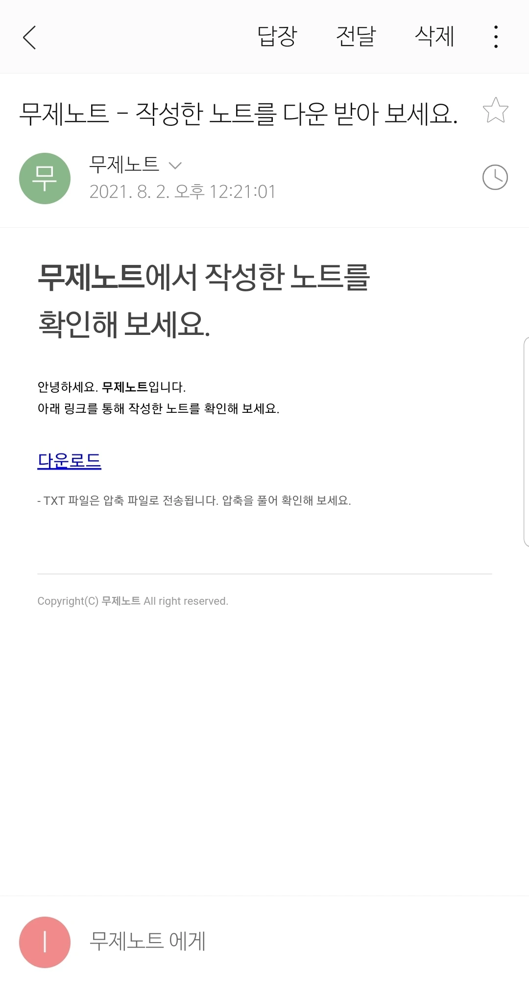 무제노트에서 작성한 글을 이메일로 받은 화면