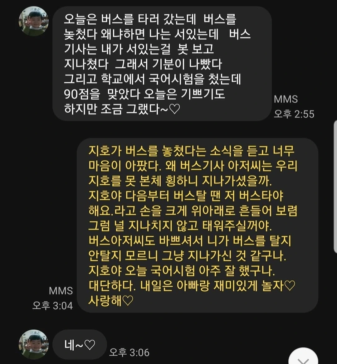 혼자 하기 힘들면 부모님이나 친한 친구들과 함께 하는 방법이다. 특히 아이가 초등학교 2~3학년이고 글자를 쓸 줄 알고 이해를 한다면 하루 일기를 세 문장 정도 문자로 주고받는다면 아이와의 관계도 돈독해지고 문장 이해력과 문장력이 좋아진다. 특히 문자를 주고받는 것이 아니라 일기를 주고받는 것이라서 부모도 같이 아이에게 일기를 보내주는 것이 좋다. 살면서 아이들과 일기를 주고받을 수 있는 기회는 그렇게 많지 않을 것이라고 생각한다.
