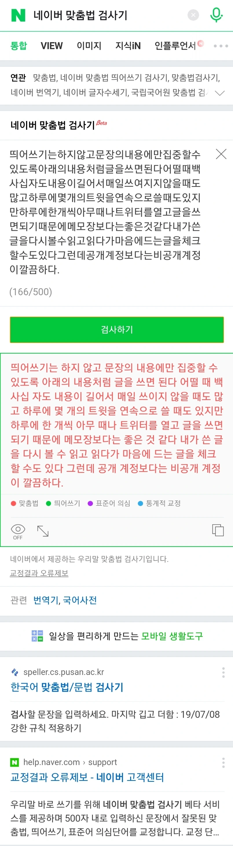 3. 트위터 비공개 계정을 이용해서 쓰는 것도 좋은 방법. 트위터는 글자 수 제한이 있고 140자밖에 되지 않아 문장을 다듬는데 많은 도움이 되는 것 같다. 십 년 넘게 트위터에 글을 써보니 나중에 글을 백업하는데 문제가 있어서 수시로 무제노트에 노트 한 권을 만들어서 옮겨 두면 나중에 일기 한 권이 만들어진다. 그리고 띄어쓰기를 하지 않은 문장은 네이버 맞춤법에 복사해서 붙여 넣기를 하면 자동으로 맞춤법에 맞게 문장을 띄워준다. 장문의 경우 한글 프로그램을 이용해서 교정을 하면 된다.