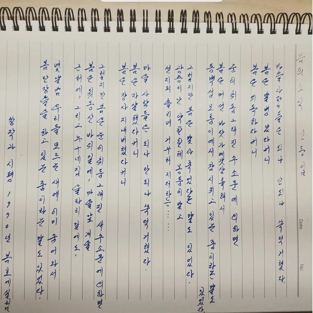 스프링 노트에 시 한편을 플러스펜으로 필사한 일기장과 모나미펜