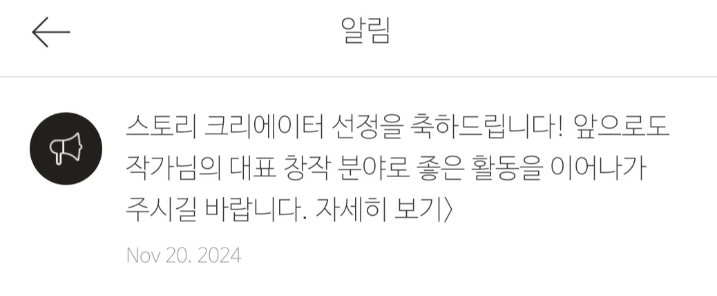 더 이상 글을 쓰지 않겠다고 생각하던 그때, 에세이분야 크리에이터에 선정되었다. 알림도 꺼 놓아 지인이 발견하고 알려주었다. 이런 배지가 이렇게 갑자기 붙는 것이구나. 들어가 보니 배지가 붙어있고 스토리 크리에이터에 선정되었다는 알림이 와 있었다.
