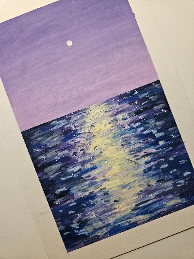 특히 얼마 전에 그린 밤바다 그림은 여러 가지 색을 여러 번 짧게 짧게 터치해서 달빛이 바다에 비치는 모습을 그려냈다. 처음 채색한 색깔은 노란색. 유튜브 영상에서 가운데 부분을 중심으로 슬쩍슬쩍 터치를 하는데 이게 나중에 어떤 부분이 되는 것인지 감이 오지 않았다. 텅 빈 도화지에 노란 짧은 선들만 이리저리 널브러져 있는 모습. 하지만 노란색에 뒤이어 보라색, 남색, 파란색, 흰색이 켜켜이 쌓이더니 일렁이는 밤바다가 완성되었다.