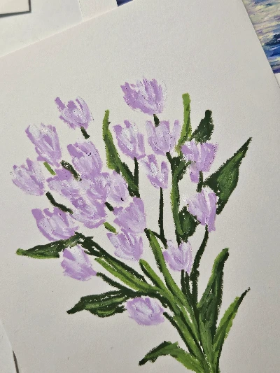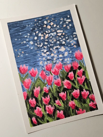 호수와 튤립 꽃밭 그림을 그리던 중 튜토리얼을 제대로 안 보고 오버한 나머지 생각보다 많은 영역에 짙은 파랑을 칠하게 되었다. 이미 칠했는데 별 수 있나. 그것보다 한 단계 밝은 하늘색으로 열심히 덮었다. 흰색도 살짝 올리기도 하고. 그 결과 본 작품은 오후 2시쯤 햇살이 내려앉은 호수였지만 내 작품은 저녁 7시의 해가 꼴딱 넘어가기 직전의 호수가 되었다. 내심 아쉬운 마음이 있었는데 다음 날 엄마가 내 그림을 보더니 말했다.