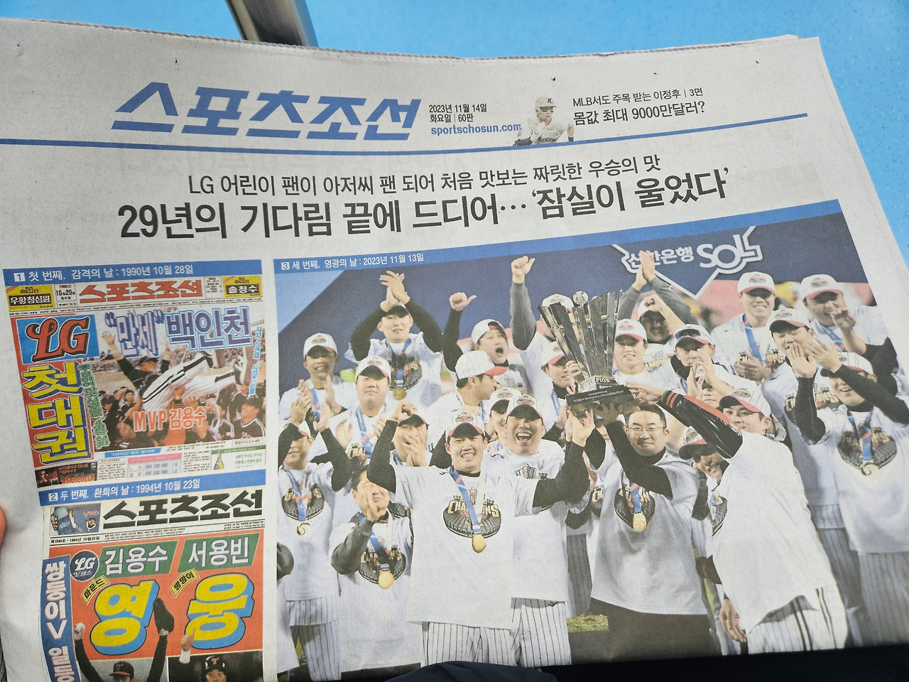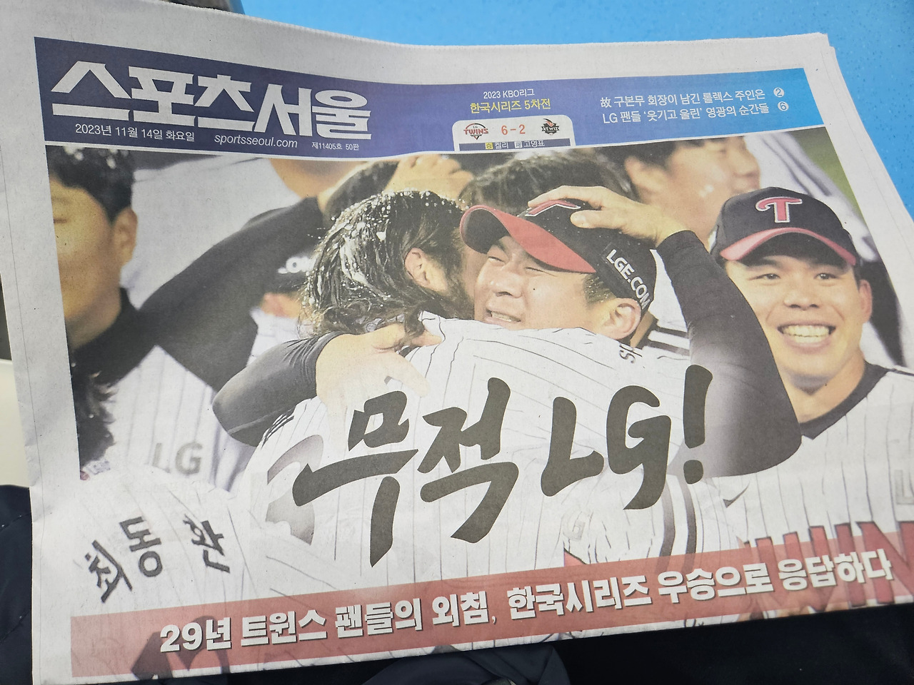 1차전부터 3차전까지 늘 최종 스코어는 1점 차였다. 하지만 1차전을 제외하고는 어떻게든 끝까지 따라붙어 기어코 경기를 우리 것으로 만들고야 말았다. 이제 지고 있어도 질 것 같지 않은 느낌까지 들었다. 고작 1번 패배를 맛보고 쉽게 돌아선 내가 부끄러웠다. 이렇게 한국 시리즈는 내게 져도 울고 돌아서며 기어코 다음을 기약하는 끈질긴 마음으로 남았다. 그렇게 투지를 발휘하여 4차전, 5차전도 승리한 끝에 29년 만의 우승 트로피를 거머쥐게 되었다. 아마 29년의 긴 세월도 패배에 쓰라렸을지라도 다음을 기약하는 끈기로 지금껏 버텨왔으리라.