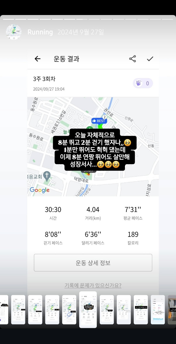 이러니 러닝에 흥미가 붙을 턱이 있나. 그러다가 하루는 걷뛰걷뛰 하지 말고 한번 달릴 수 있는 만큼 쭉 달려보자라는 생각이 들었다. 원래 성격이 급한 탓에 이렇게 3분씩 뛰어서 언제 30분을 내리뛸 수 있겠냐며 답답한 마음이 들었던 것도 사실이다. 그렇게 그날은 한번 각 잡고 페이스를 늦춰 달려보았다. 오, 나쁘지 않은데? 물론 처음으로 마의 5분을 넘겨보는 거라 힘들지 않았다면 거짓말이지만 이대로라면 쭉 달릴 수 있을 것 같았다. 그렇게 8분을 쉬지 않고 뛰었다. 30분도 거뜬히 달리는 지금 기준에서 생각하면 정말 귀여운 숫자지만 그날의 성취감은 잊을 수 없다. 내가 8분을 내리 달리다니! 그 성취감이 마라톤 신청까지 이끈 것이다. 지금 나의 1키로 페이스는 보통 7분 30초다. 여자들도 6분 30초 정도로는 뛰던데 솔직히 내가 느린 건 사실이다. 남들보다 키가 작으니 다리도 짧아서 어쩔 수 없는 거라고 나름 합리화해 본다. 하지만 7분 30초 페이스도 내 심장에겐 많이 벅찬지 평균 심박수가 170을 찍는다. 심장이 터지는 것보단 느린 게 나으니 내 페이스를 나라도 사랑해야지, 별 수 있나. 요즘 들어 느끼는 건데 점점 내가 나를 많이 사랑하게 된 것 같다. 이런 내가 나쁘지 않다.