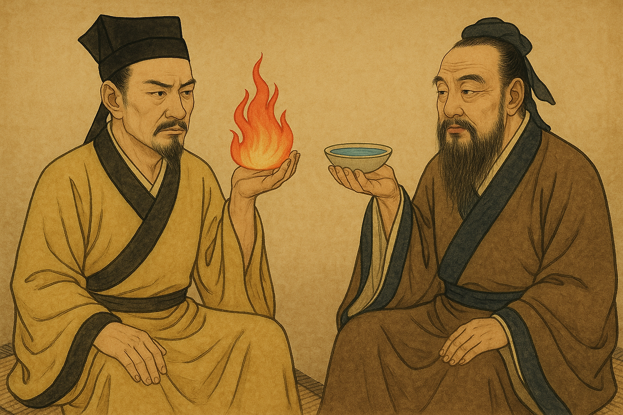 한비자의 법가(法家) 사상과 공자의 유가(儒家) 사상도 '어떻게 보느냐의 차이'다. 한비자(韓非子)는 유도(喩老) 편에서 법가 사상을 불로, 유가 사상을 물로 비유했다.