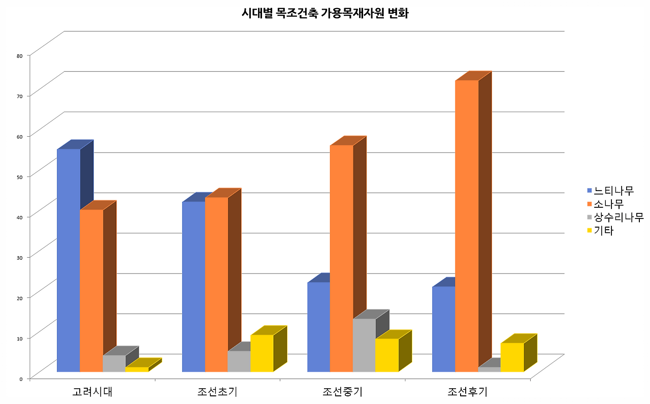 우리는 흔히 사찰이나 궁궐의 기둥을 소나무로 쓴다고 알고 있지만 고려시대까지는 소나무(40%)보다 느티나무(55%)를 더 많이 사용했던 것을 보여준다. 조선초기는 비슷하게, 조선중기부터는 소나무가 월등히 많이 사용되기 시작했다. 그러므로 소나무를 전통나무로 인식하는 것은 조선시대 초기를 거치면서 중기부터 만들어진 것이라 볼 수 있다.