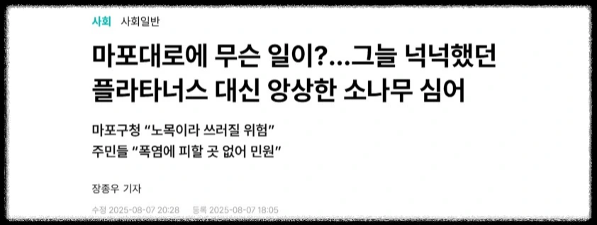 얼마 전 서울 마포구청은 마포대교 북단부터 공덕역까지 마포대로 구간 가로수를 플라타너스(양버즘나무)에서 소나무로 교체했다. “외국 정상이 서울을 방문할 때 이용해 '귀빈로'라는 별칭을 얻은 마포대로에 전통 나무인 소나무를 심어 한국의 자연미와 휴식공간을 제공한다”는 설명을 덧붙였다. 과연 그럴까? 아무튼 17억여 원을 들여 양버즘나무 82주가 사라지고, 소나무 189주가 새로 들어섰다.