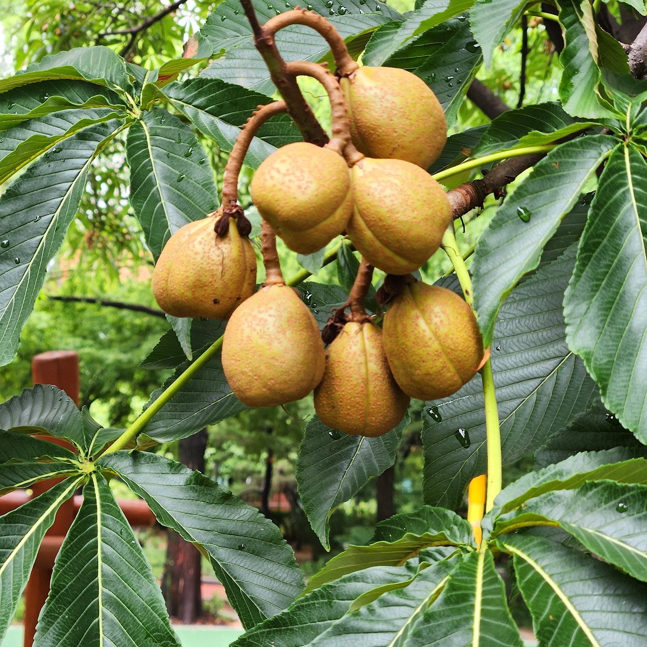 마로니에(marronnier)는 프랑스어 밤(marron)에서 유래된 이름이지만 이 나무에 열리는 밤은 먹을 수 없다. 밤나무에 속하고 싶었으나 실패(?)한 나도밤나무과로 높이가 30m까지 자란다. 대학로의 마로니에 공원과 '칵테일 사랑'이라는 대중가요로 널리 알려져 친숙한 이름이다. '마로니에'하면 매우 세련된 이름으로 들리지만 우리말로 바꾸면 갑자기 시골느낌이 확 풍겨온다. 이름하여 "칠엽수"(七葉樹), 말 그대로 '잎이 일곱 개'라는 매우 직접적이고 '칠'때문인지 컨츄리 분위기가 물씬 풍긴다.
