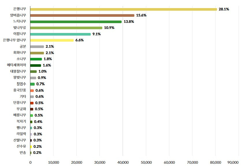 서울 가로수 트리맵에 따르면 2025년 현재 서울에는 총 287,714그루의 가로수가 있고, 그중 가장 많은 것은 34.7%나 차지한 은행나무(암나무 포함)다. 또 산림청 자료에 따르면 전국단위에서 가장 많은 가로수는 벚나무다. 2022년 기준 전국 1천98만 그루에 이르는 가로수중 164만 그루를 차지했다.(왕벚나무+벚나무)
