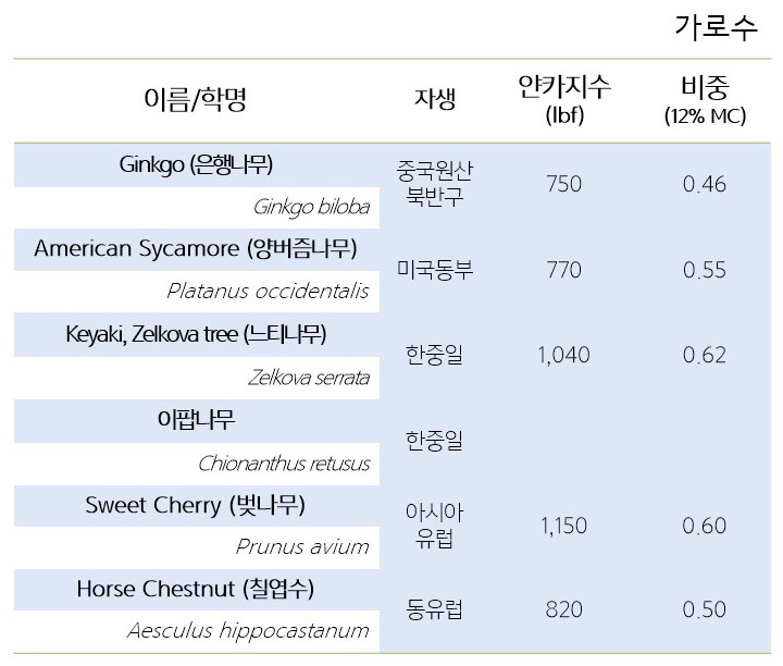 가로수들도 모두 목재로 사용이 가능하겠지만 표의 나무 중 목공방에서 비교적 자주 만날 수 있는 목재는 '느티나무'와 '벚나무'다. 벚나무 목재는 '체리목'이라고도 부르는데 이 두 나무는 모두 얀카지수가 1,000을 넘기고 있다. (1,000이 넘으면 꽤나 단단한 나무라고 생각하면 된다)