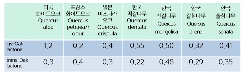 아직은 우리나라 증류주들이 미국산 오크통을 주로 사용하고 있는 것으로 보인다. 이런 연구를 통해 앞으로 한국 참나무에 숙성한 새로운 한국 술 브랜드를 기대해 봐도 좋지 않을까?