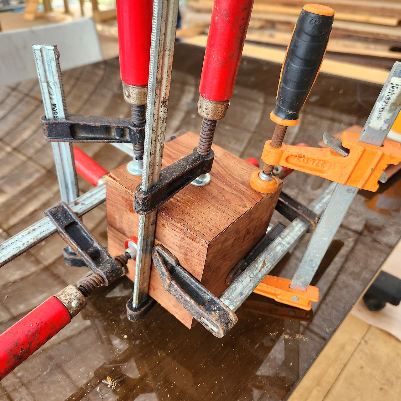 먼저 가로세로 100mm짜리 6개 판재를 만들고 테이블쏘(Table Saw)의 각도를 45도 기울여 각 면을 비스듬하게 깎아나간다. 그렇게 6개의 정사각형 참죽 조각을 만든 후 각 면을 목공본드로 접합한다. 접합 후 클램프(clamp)로 조이고 고정시킨 후 기다린다. 이 때 6개의 면중에 눈에 주로 보이는 윗면과 정면으로 사용할 판재는 미리 정해놓는 것이 좋다. 그 면이 이 상자의 얼굴이 되니까...