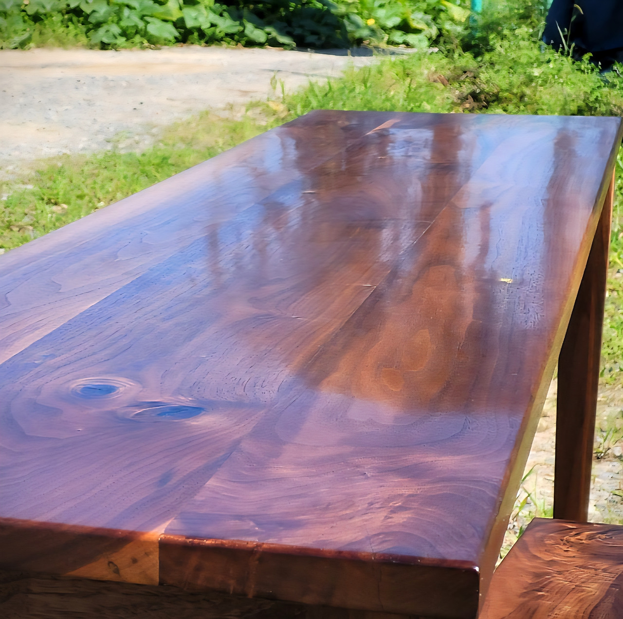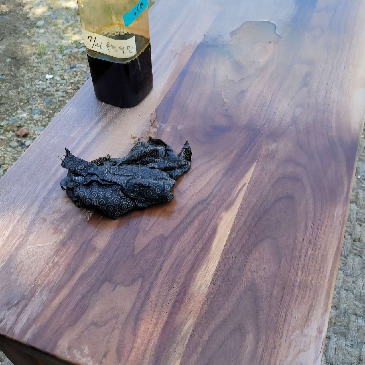 이젠 공방장이 만든 명유(明油)를 가구에 바른다. 북미산 월넛(Walnut)으로 만든 테이블에 5일간 3회에 걸쳐 발랐다. 결과는 꽤나 성공적이다. 나무의 무늬와 색을 잘 살아나고 있음을 확인할 수 있다. 재미있는 것은 공방장과 나는 같은 방송사의 프로듀서인데, 공방장의 아내인 형수님과 나의 아내도 각각 심리상담센터를 열었다. 두 커플 모두 PD와 상담심리사 커플인 셈이다. 형수님과 '참 신기한 일'이라고 대화를 나누기도 했다. 명유를 바른 월넛 테이블은 그 형수님의 심리상담센터에 지금도 설치되어 있다.