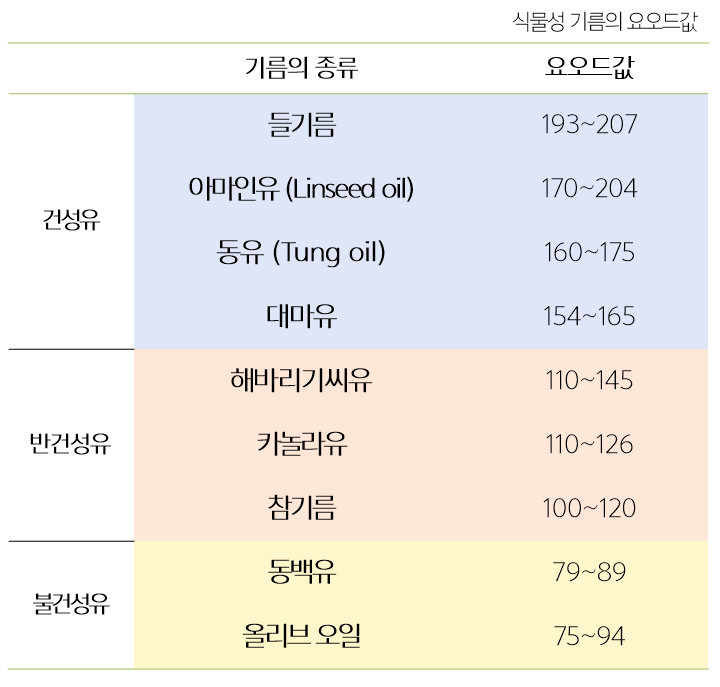 기름이 굳는 정도를 화학적으로 표현한 것을 요오드값(iodine value)이라고 하는데 130 이상을 건성유, 100 이하는 불건성유라 하고 그 사이 값이 반(半)건성유다.