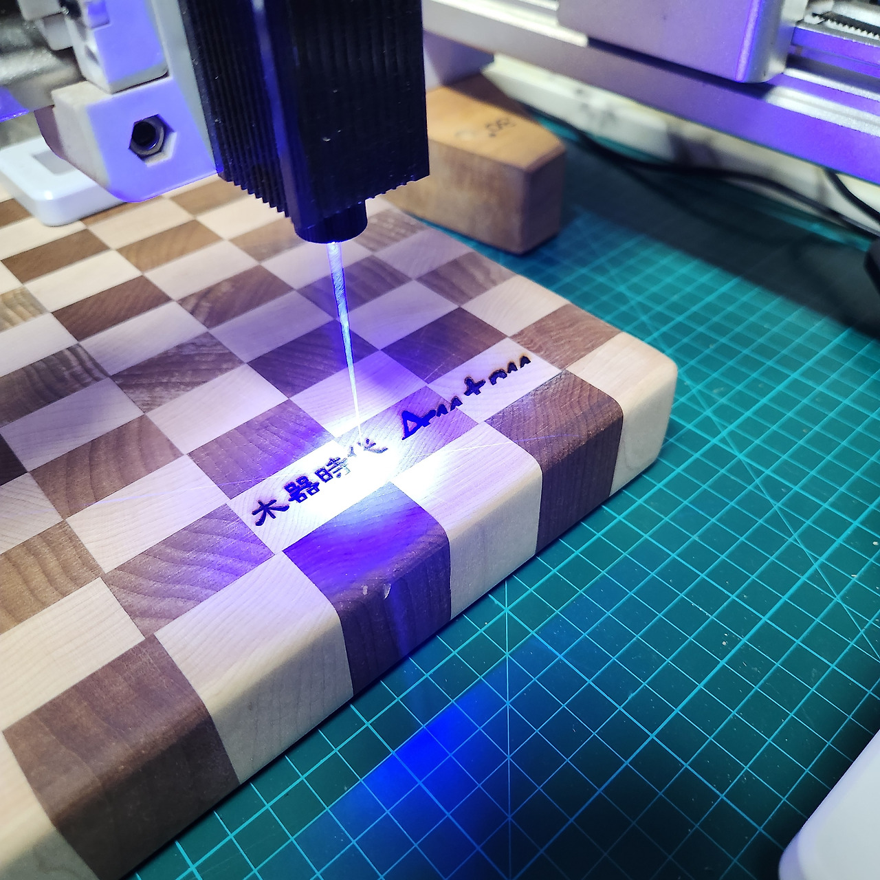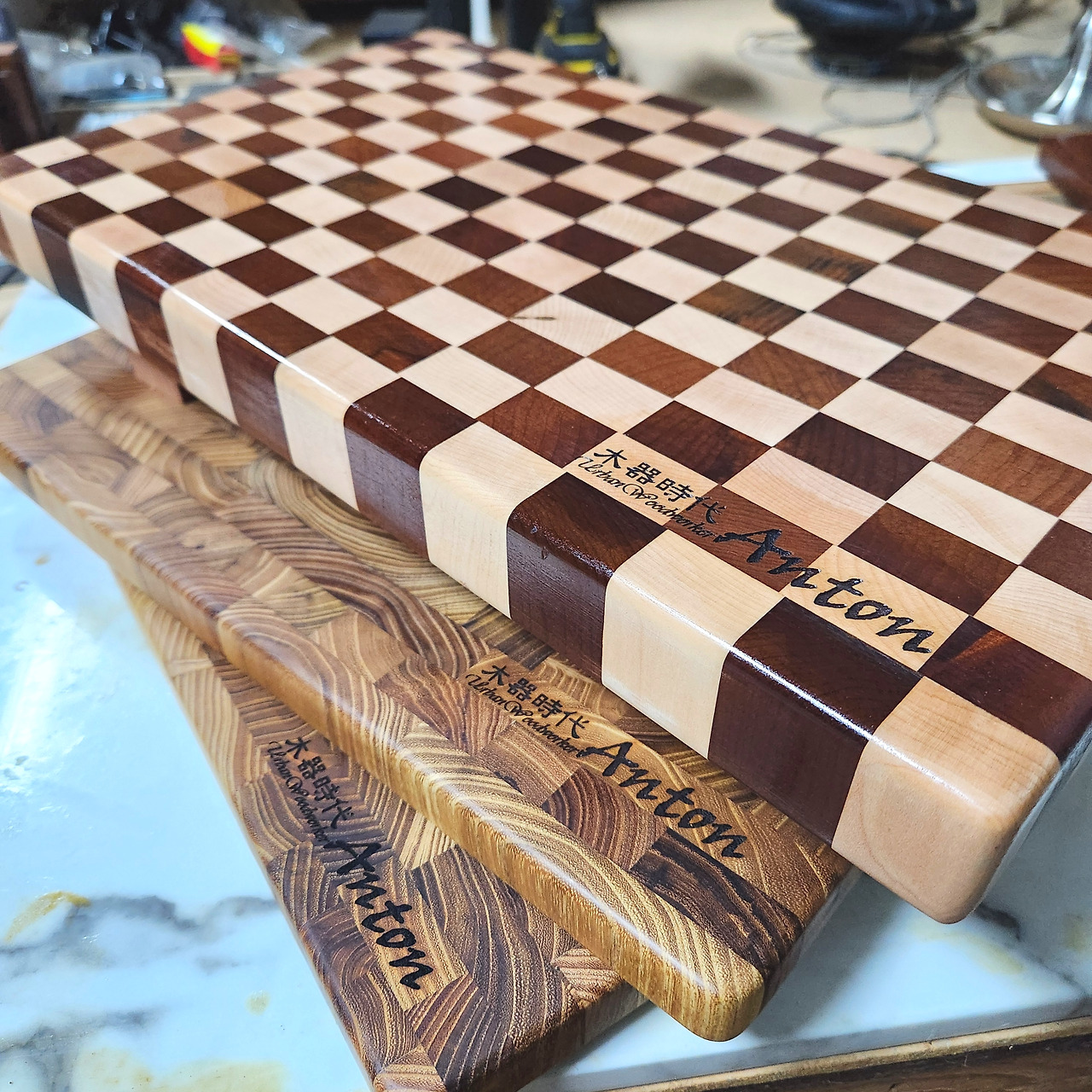 한 번쯤은 있어 보이고 싶은 안톤도 '메이플'과 '탄화 메이플'을 이어 붙인 엔드그레인 도마를 작업하기로 한다. 같은 메이플이지만 내츄럴 메이플과 탄화 메이플의 색감 차이를 이용한다. 정성스럽게 샌딩(Sanding)하고 "목기시대 UrbanWoodworker Anton"을 새겨넣으며 오늘의 목공을 마감하기로 한다.