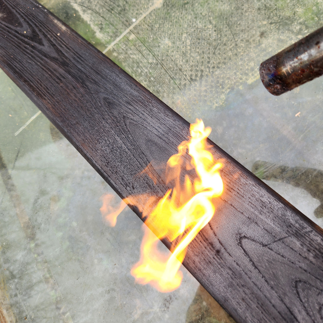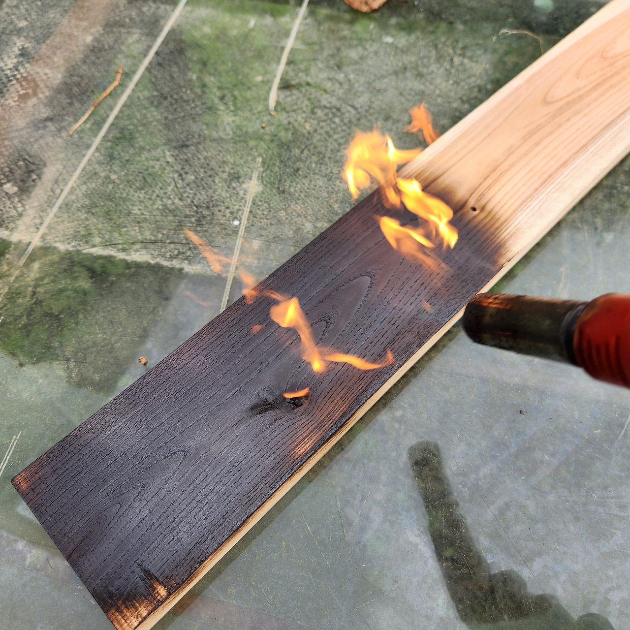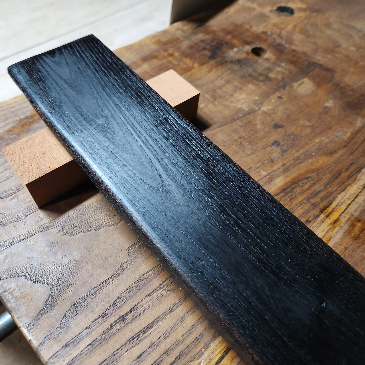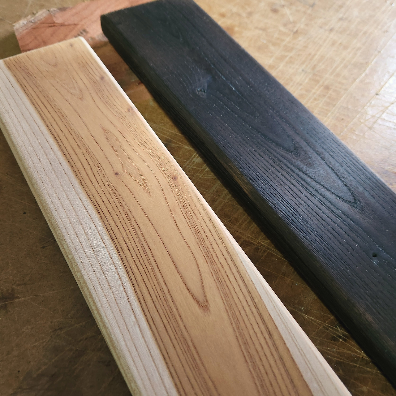 공방에 있는 느티나무 판재로 낙동법을 해봤다. 불로 겉면을 태운 뒤 솔로 재를 모두 긁어낸 다음, 오일을 발랐다. 재는 전혀 묻어 나오지 않으면서도 꽤 믿음직스러운 까만 목재가 되었다. 느티나무 원목과의 색이 완전히 달라진 것을 볼 수 있다.