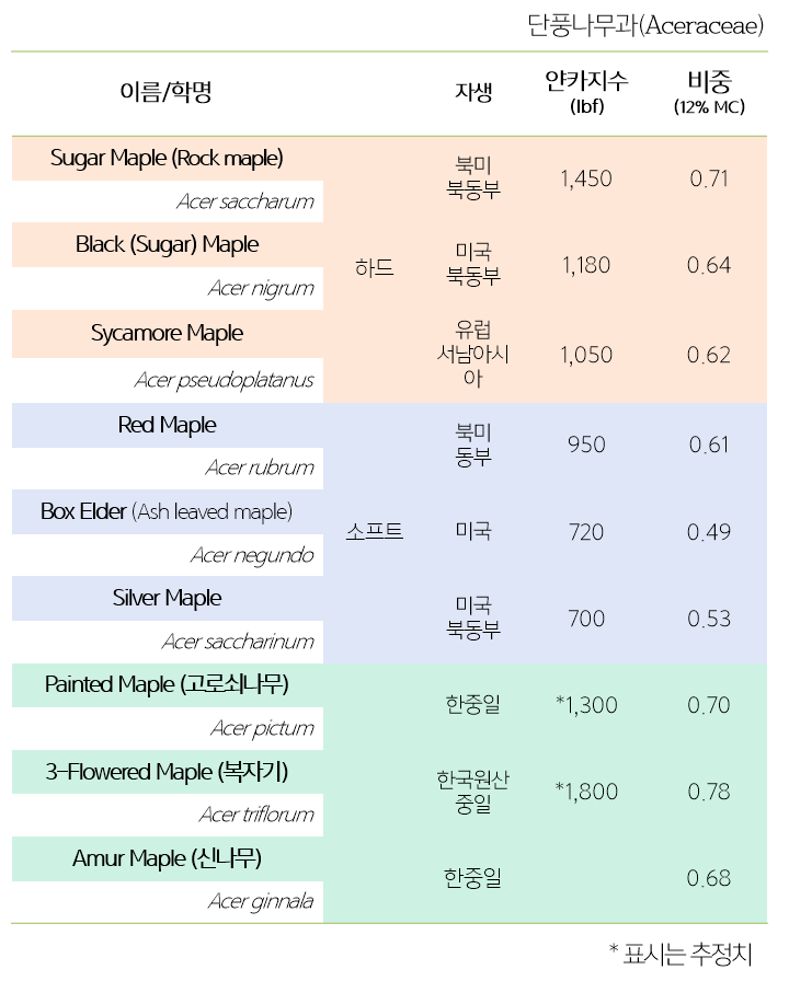 한국에서 자생하는 '단풍나무 3형제, 고로쇠, 복자기, 신나무'의 비중을 추정해 보면 모두 '하드 메이플'에 속할 것으로 예상된다. 단풍나무 중에 가장 단단한 목재가 Sugar Maple로 알려져 있지만 우리나라 토종 단풍인 '복자기'가 더 단단할 것으로 미루어 짐작할 수 있다. 다만 '복자기'는 얀카지수를 측정한 기록이 없어 추정만 할 수 있다.
