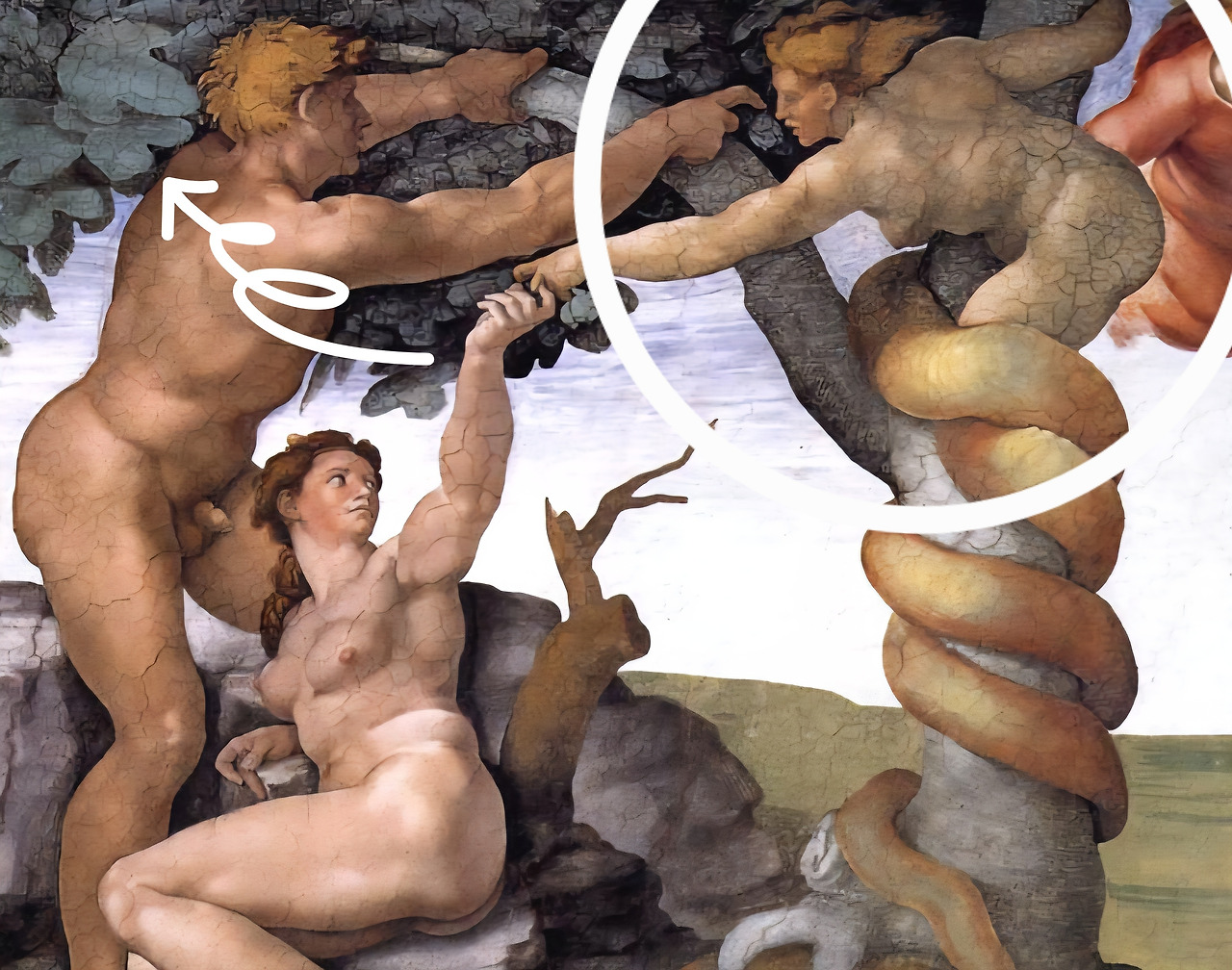 성경에서는 알다시피 뱀의 유혹에 넘어간 이브가 하느님의 명령을 어기고 아담과 같이 선악과를 먹는다. 그러자 그들은 "눈이 열려" 서로가 알몸인 것을 알았고 하느님은 벌로 '여성에게는 영원한 임신의 고통을, 남성에게는 영원한 노동의 고통'을 내린다.