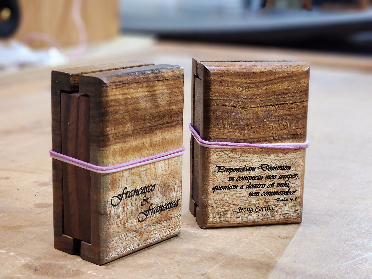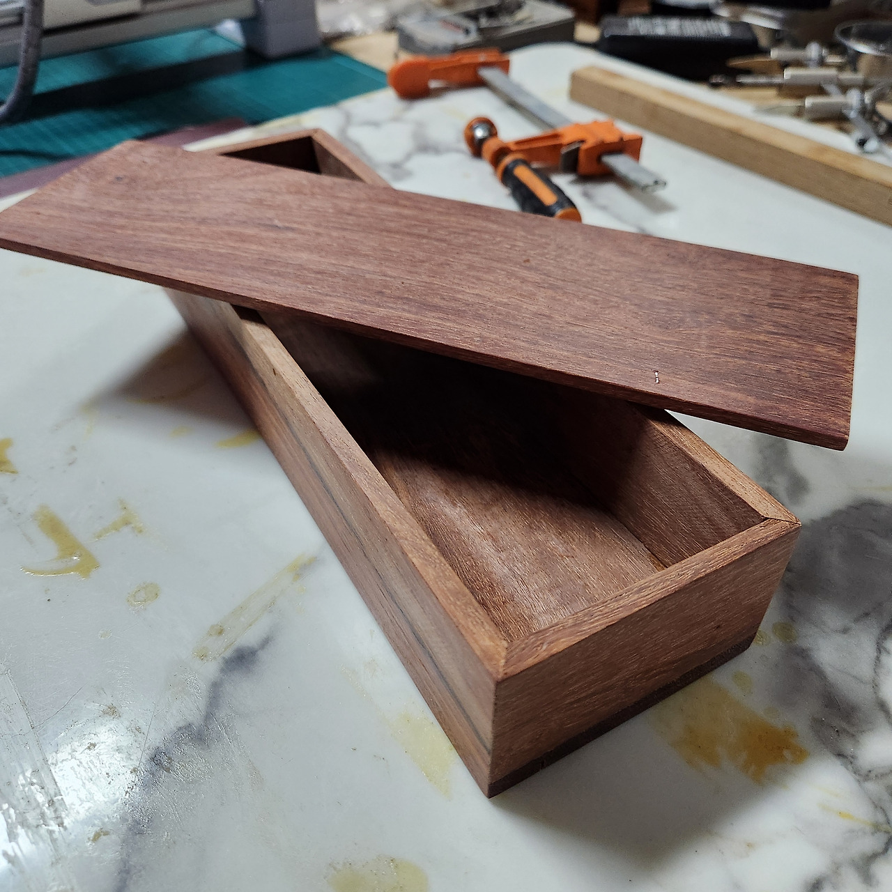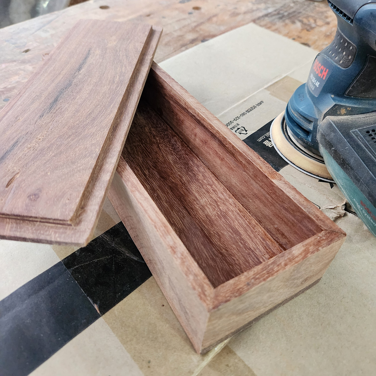 부빙가를 얇게 켜서 여러 개의 얇은 판재를 만든 후 기다란 박스형에 맞게 접착하고, 뚜껑은 주변으로 홈을 낸다. 부빙가는 얀카 지수(Janka Index)가 2,410 lbf로 워낙 단단해 얇아도 무척 든든하다. 그리고 목재 자체가 유분을 머금고 있어 샌딩과 오일링을 하기 전에도 맨질맨질하다.