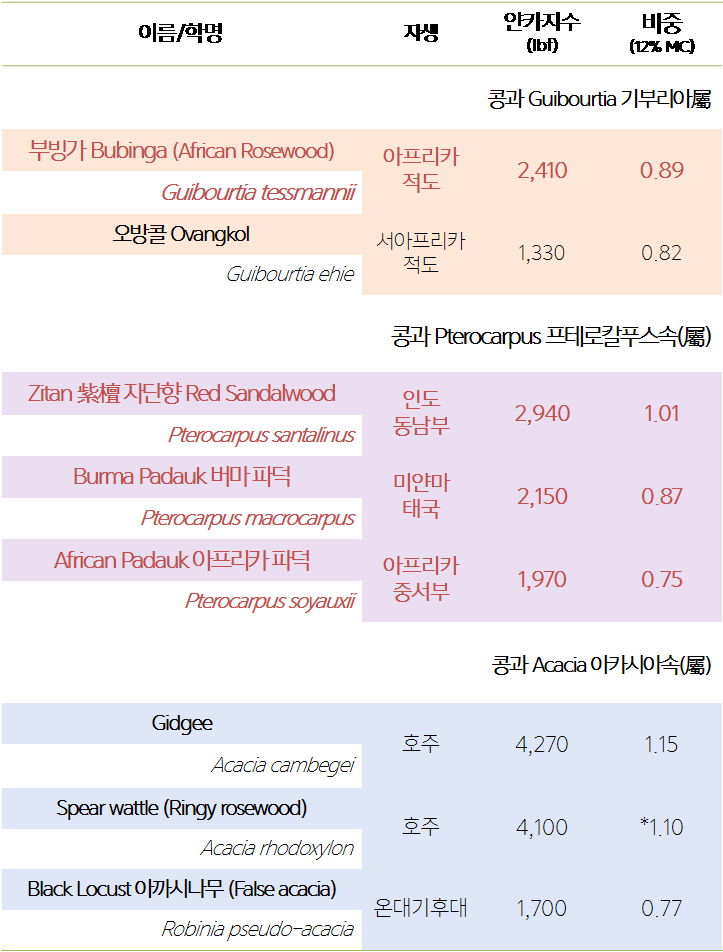 콩과(Fabceae) 나무 중 달베르기아 속을 제외한 기부리아, 프테로칼푸스, 아카시아 속의 나무 중 일부를 정리했다. 수치를 보면 '저 세상 나무'같이 우리 주변에서는 보기 어려운 높은 수치들이다. 상상이상으로 무겁고, 상상이상으로 단단한 나무들이 넘친다.