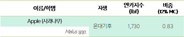 자료를 찾아보니 사과나무는 자연에서는 10m 높이까지 자라는 생각보다 큰 나무이고, 얀카지수(Janka Index)가 1,730 lbf에 이르고 있어 공방에서 자주 사용하는 하드우드들, 물푸레나무(Ash), 참나무(Oak), 호두나무(Walnut), 벚나무(Cherry) 보다 더 단단하고 더 무겁다. 공방에서 못 본 이유는 과실수이기 때문에 목재로 대량생산되지 않았기 때문인 것으로 보인다.