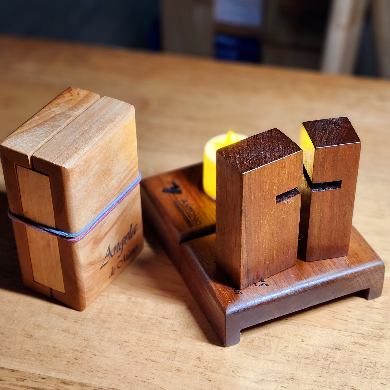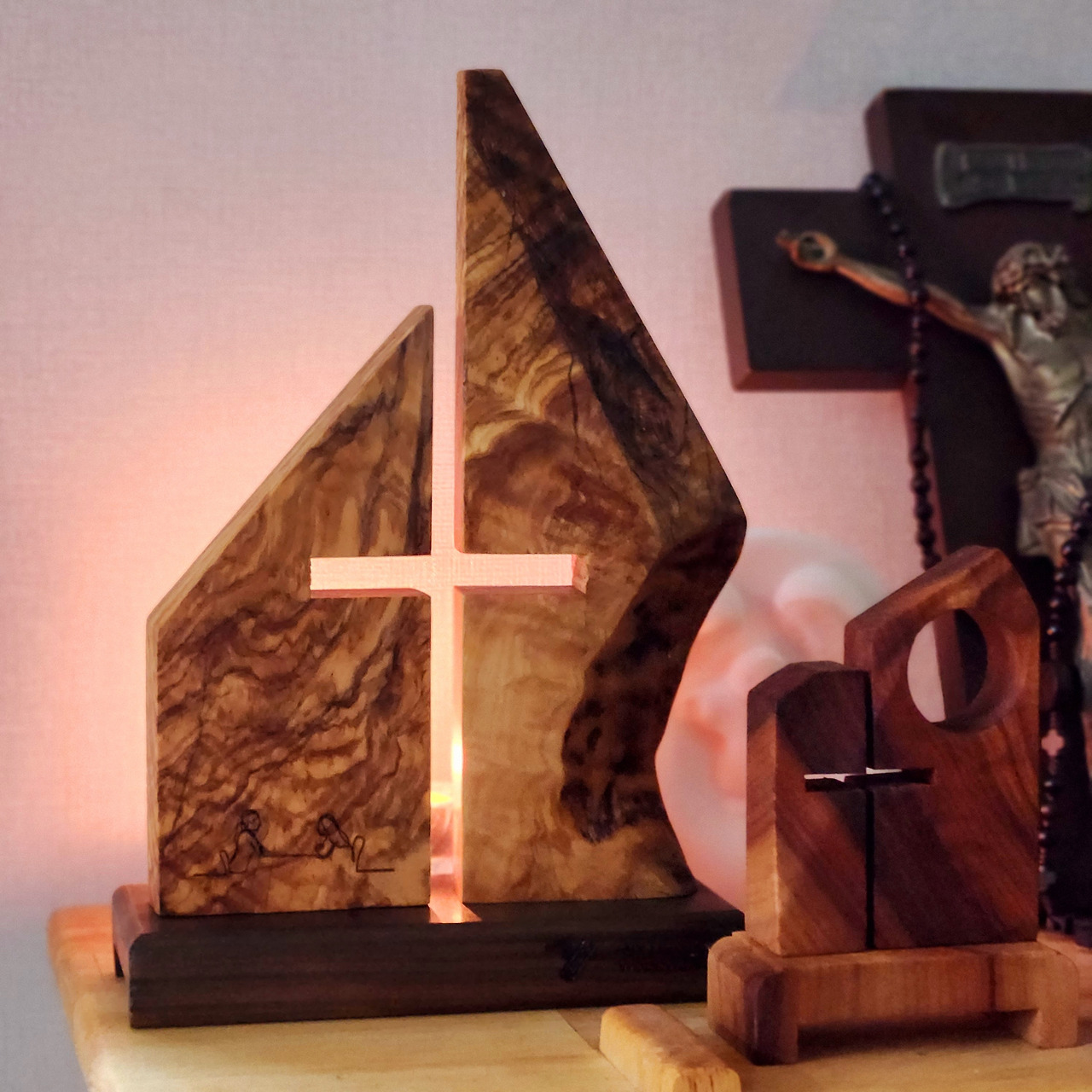 가톨릭 신자인 아내를 위해 올리브 나무로 십자가를 만들었던 기억이 떠올랐다. 기도하는 손 모양을 흉내 내고, 십자가 형상은 뒤편에 놓인 불빛이 새어 나오며 나타날 수 있도록 했다.