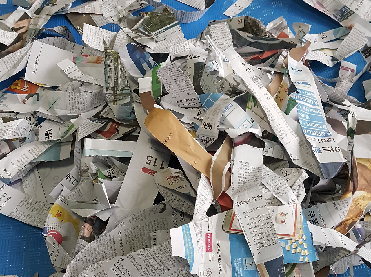 계속 찢다 보면, 어느새 소복이 연 꼬리 같은 신문지 산이 쌓인다.