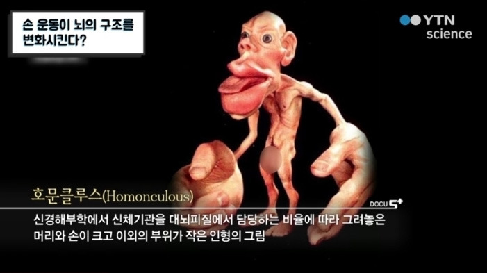 호문클루스 뇌지도에서 손과 입은 기능은 뇌의 많은 영역을 차지한다.