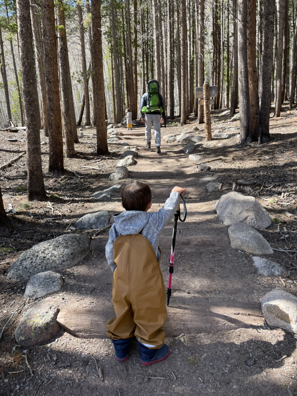 마냥 기다릴 순 없으니 좀 떨어진 곳에 차를 세웠다. 바람이 세고 공기가 차가워서 네 식구 모두 두터운 후드티를 입고 도로를 따라 걸어가는데 200미터도 채 안 될 거리가 몇 백 미터처럼 느껴졌다. 트레일 헤드에서 내리자 아이들이 등산지팡이 욕심을 낸다. 각자 한 개씩 짚고 산행 길로 들어섰다. 빽빽한 소나무 사이에 난 흙길이 잘 다져져 있어서 쉬운 곳에 왔다는 착각을 했다.