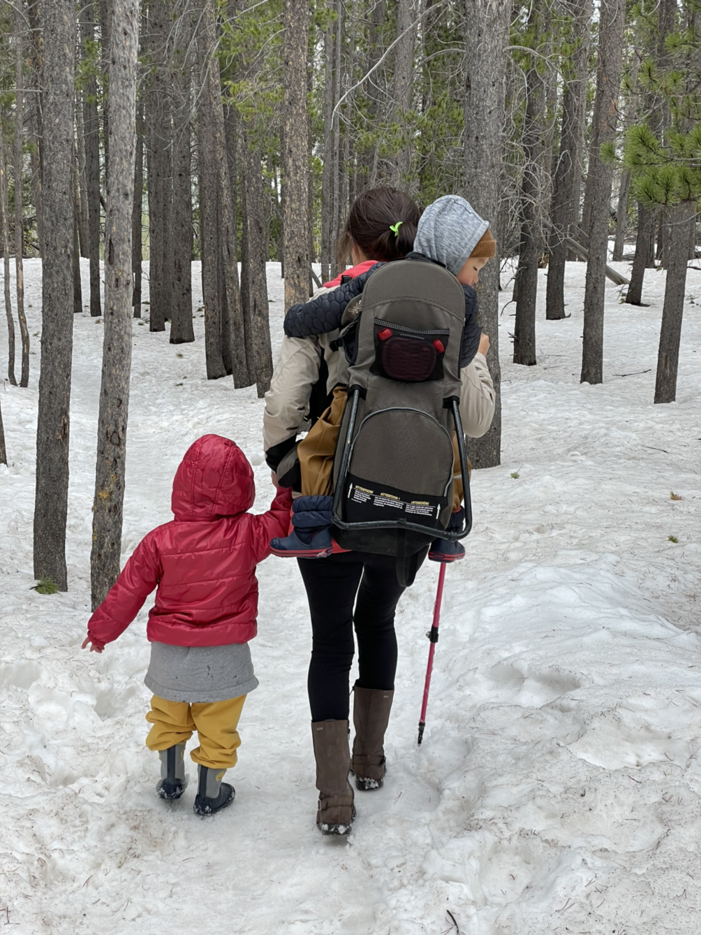 짙은 호수와 눈과 우리 네 식구만 보이는 사진을 남기고 하산을 시작했다. 꽃과 사자는 캐리어에 앉아 만족스럽게 초콜릿을 빨아먹고 있었다. 소나무 숲을 빠져나가기 전 남편을 보니 도저히 안 될 것 같아 내가 사자를 업고 꽃은 손 잡고 걸어가기로 한다. 꽃의 컨디션은 최상이었다. 하산길 절반 이상을 걸었고 더할 나위 없이 행복하게 웃었다.