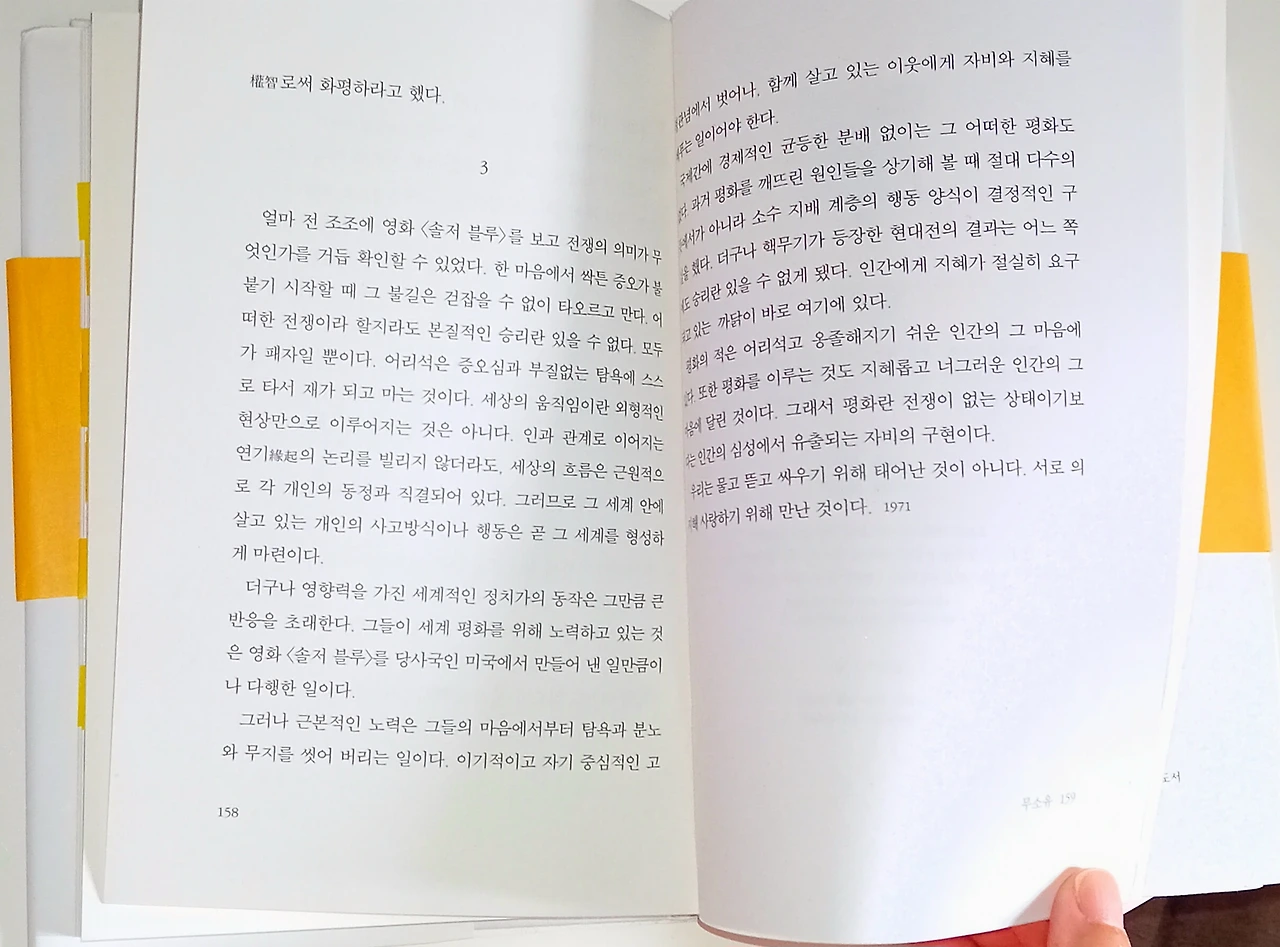 인간 존재에 있어서 기본적인 구조는 세상에 있다는 사실이다. 세상에 있다는 것은 함께 있음을 뜻한다. 사람은 혼자서 살 수는 없다. 서로서로 의지하여 관계를 이루며 살아간다. 그러기 때문에 저쪽의 불행이 내게 무연하지 않다. (p.157)