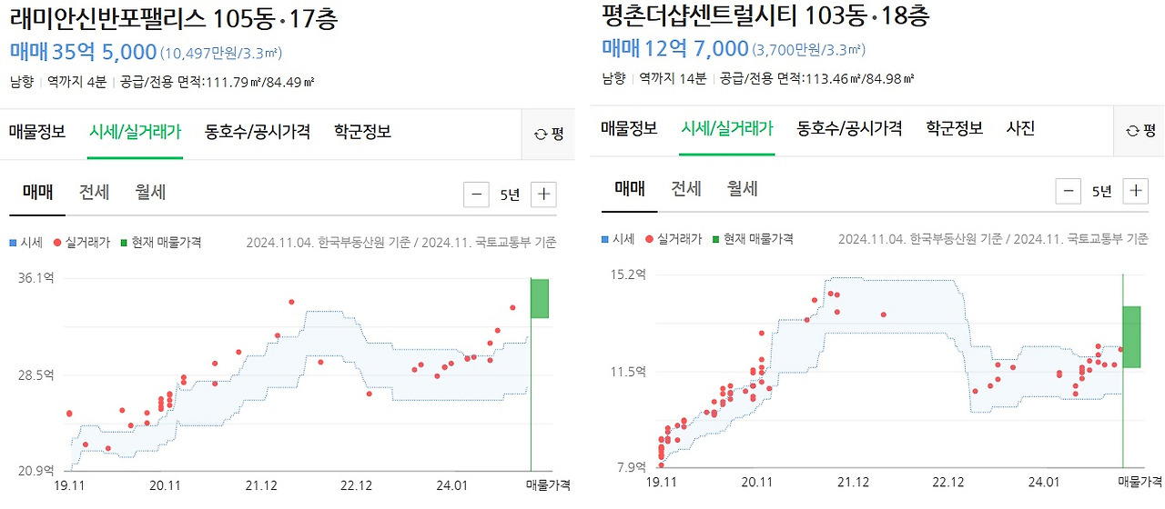 반면 평촌더샵센트럴시티는 2021년 9월 실거래가 14억5천만원으로 최고치를 찍은 뒤 꾸준히 시세가 하락하다가 올해 5월 최저 실거래가인 10억7천만원에 거래됐다. 하락폭이 4억원(36%)이다. 그 이후 최고가 시절 시세를 회복하지 못하고 10~12억원 사이에서 거래되고 있다.