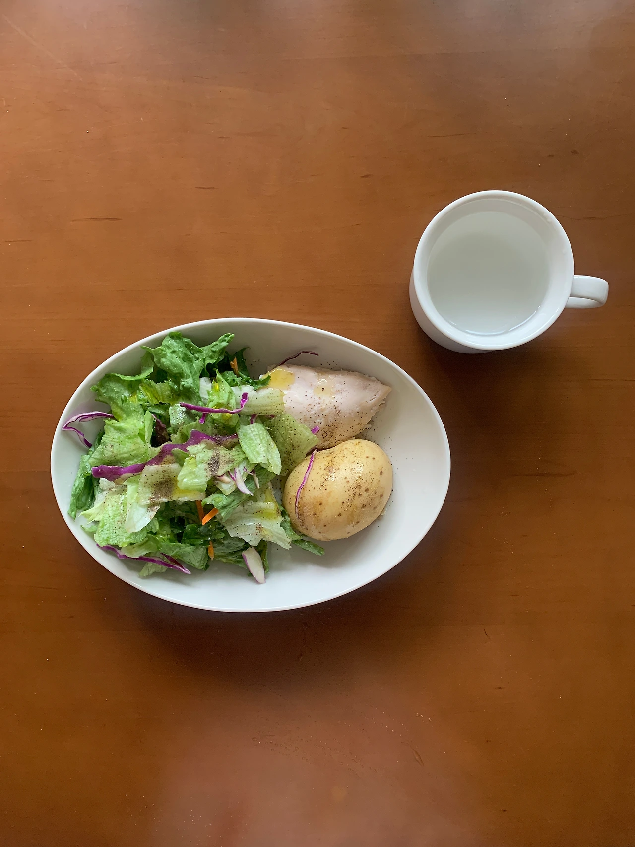 이렇게 고정된 아침 식단을 먹은 지도 2주가 넘었습니다. 나만의 아침 루틴에 특별한 도구를 마련하고 싶어, 이 아침 식사만을 위한 흰 타원형 보울을 무인양품에서 구매했습니다. 매일 아침 일어나자마자 러그 위로 미끄러지듯 내려와 5분간 매일 똑같은 요가 영상으로 스트레칭을 한 후, 이 보울을 꺼내 (미리 쪄 두었던) 감자와 닭가슴살을 오른쪽에 놓고 전자레인지에 50초 돌립니다. 그 사이 양상추와 치커리를 먹기 좋은 크기로 찢어 물로 씻어낸 후, 보울을 꺼내 왼쪽의 빈 공간에 넉넉히 담습니다. 그리고 그 위에 올리브유와 후추를 뿌려주면 저의 아침 식사 리추얼 준비가 완성됩니다. 그리고 젓가락을 들기 전, 물을 한 모금 먼저 마십니다.