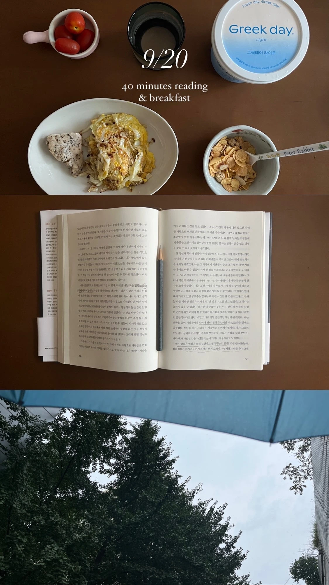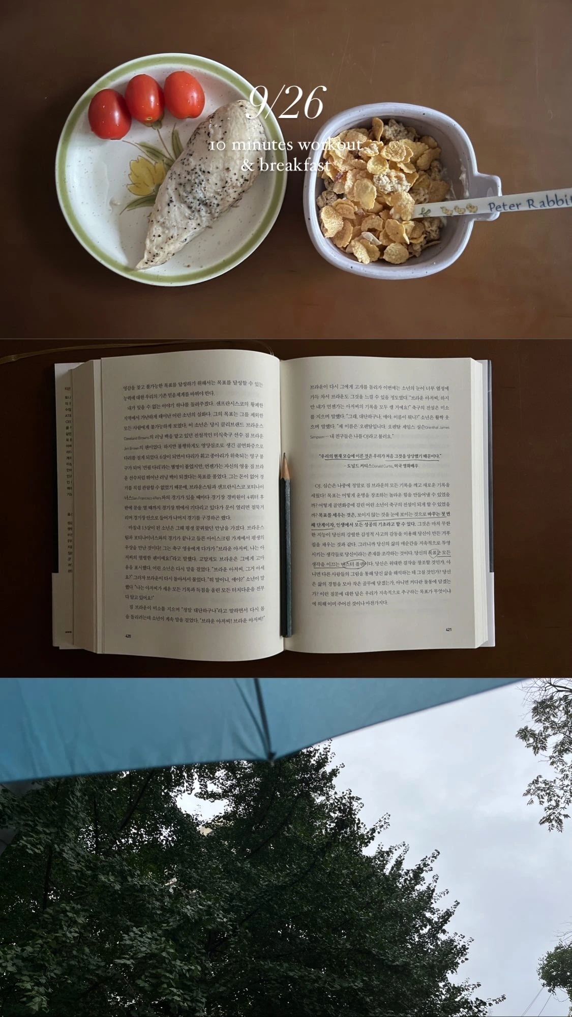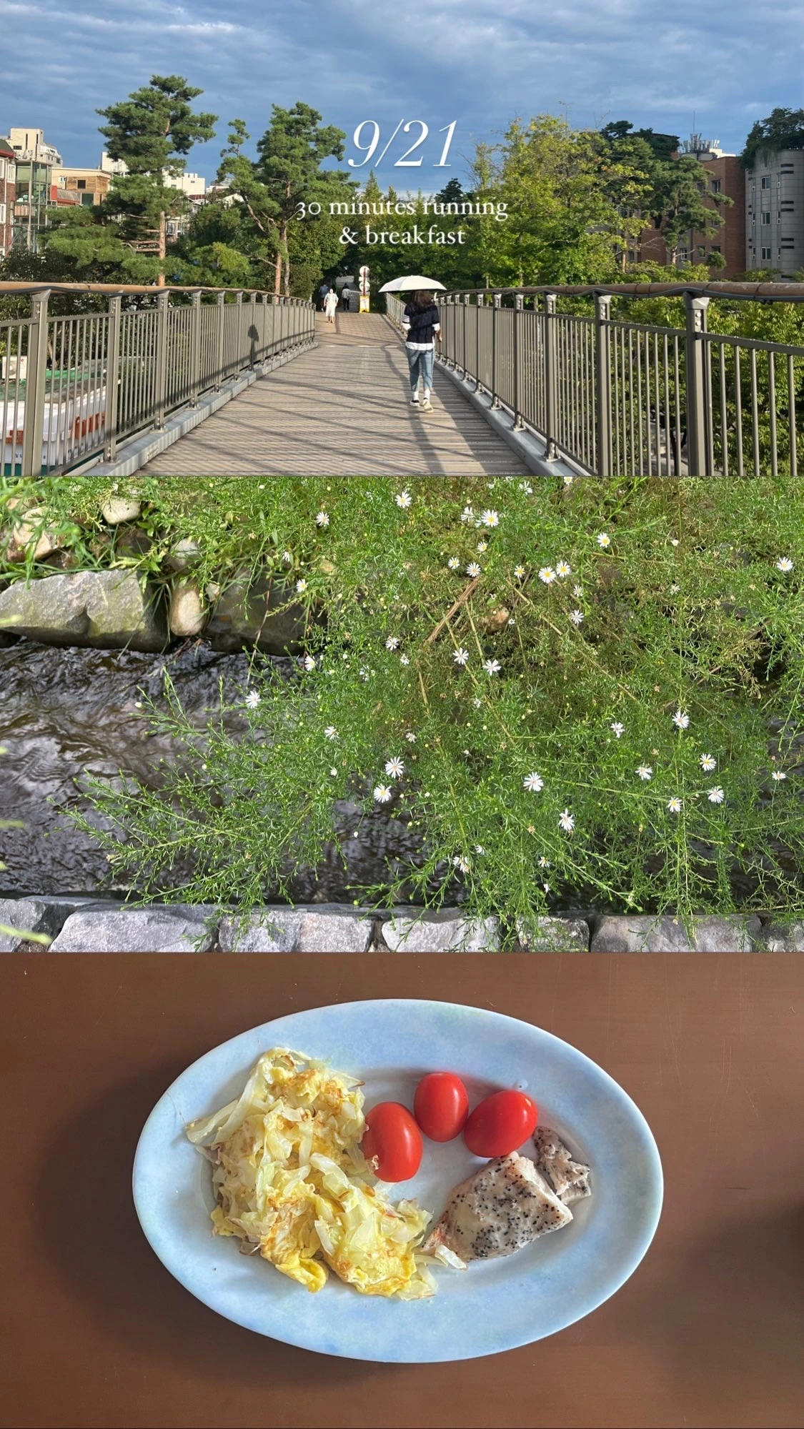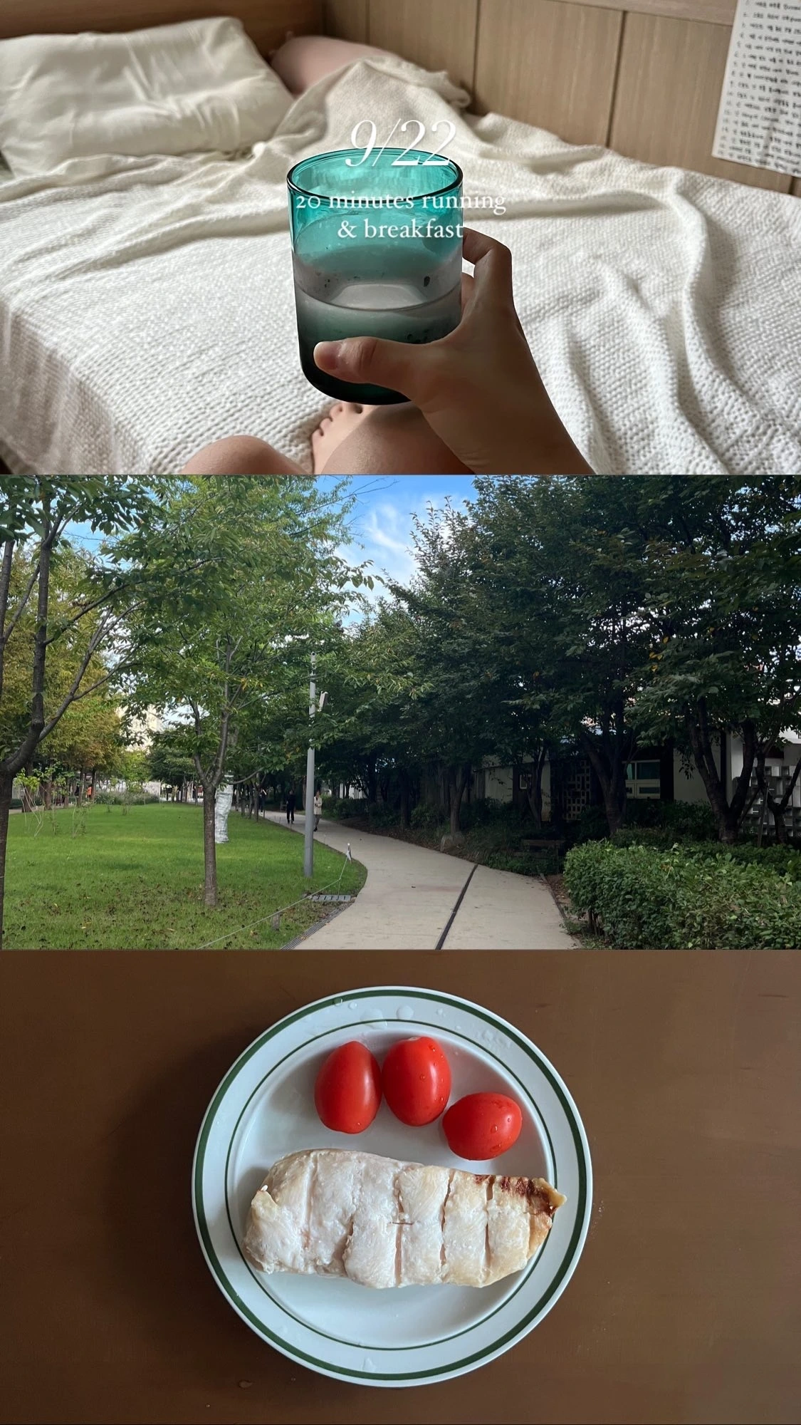 콜라주의 힘이란 이런 것일까요. 한 장으로는 별 감흥 없는 장면일지라도, 두세 장이 함께 모여 있으면 각 사진이 서로 분위기를 공유하면서 특유의 감각적인 화면을 만들어 냅니다. 싱그러운 산책길의 풍경, 아침 식탁의 풍경, 책의 페이지... 서로 다른 순간을 한 컷으로 묶는 순간, 생각보다 나의 아침이 낭만적으로 보이는 마법이 벌어집니다.