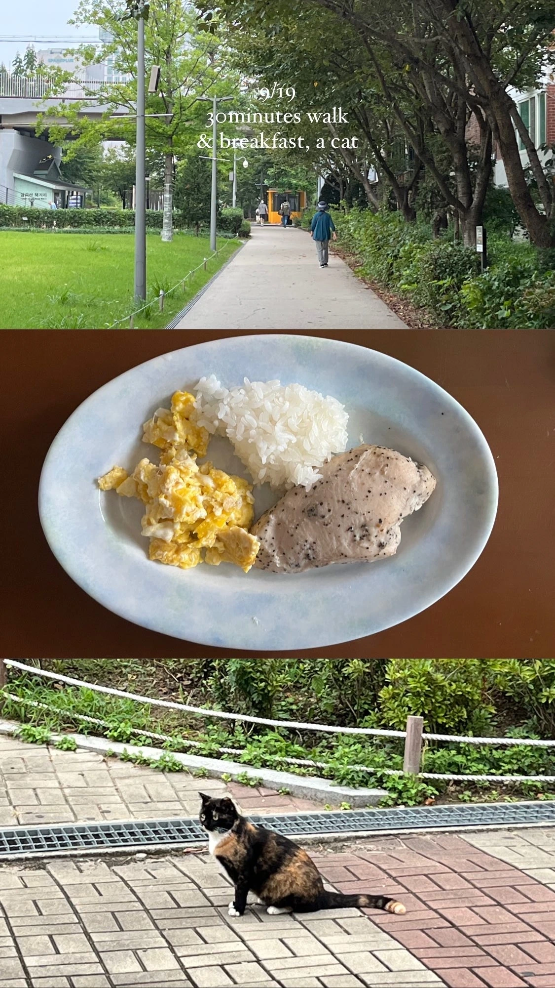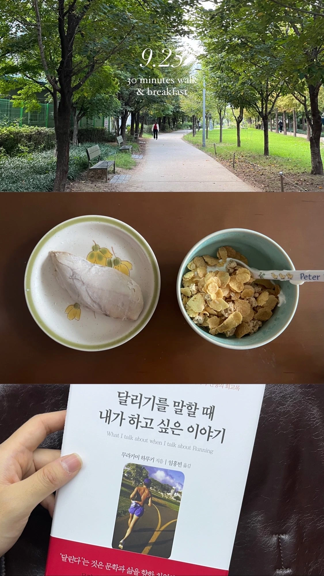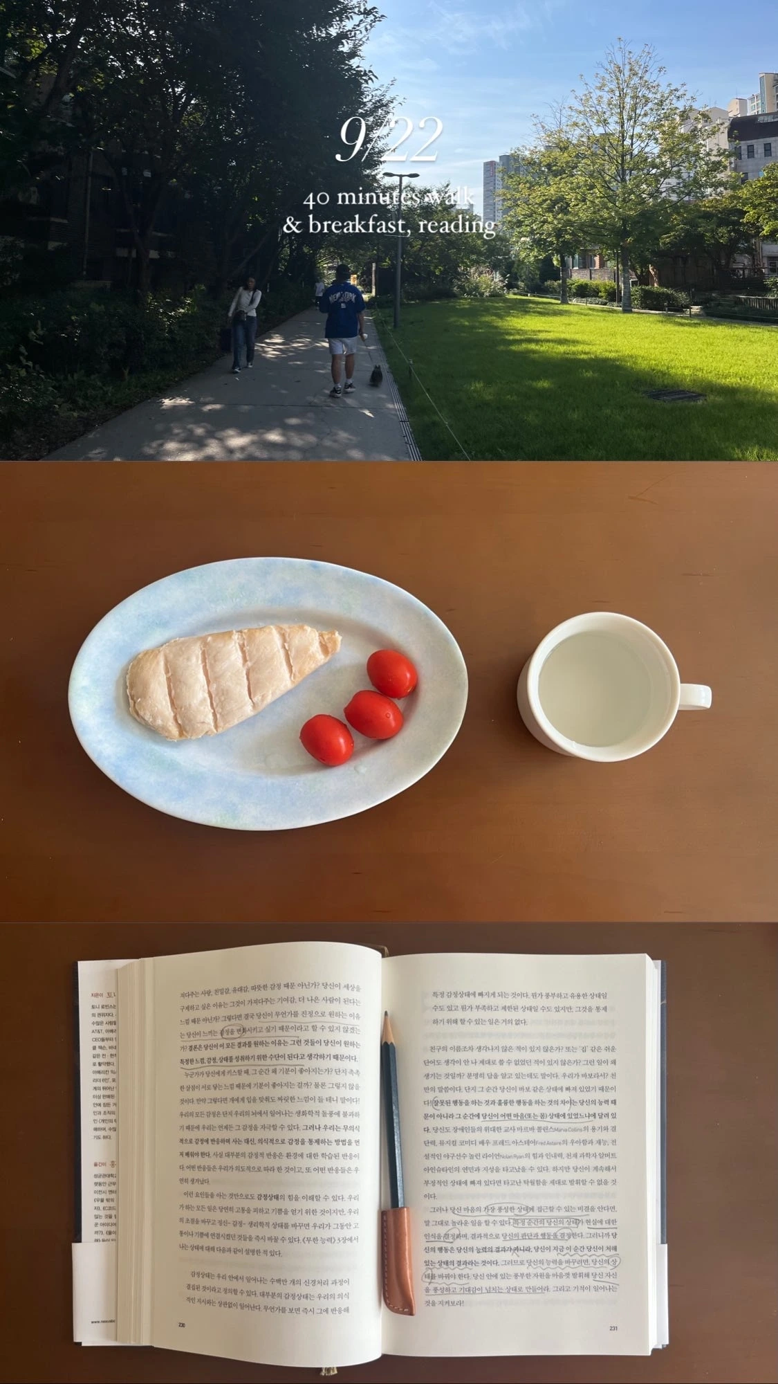 이 물음에 그렇다는 대답을 하셨다면, 역시나 저와 함께 아침을 기록해 봅시다. 위의 7가지 리스트를 보신 바와 같이 저의 아침은 매일 비슷한 패턴으로 반복됩니다. 하지만 아침의 기록들을 모아 봅시다. 매일 같은 산책길을 걷고, 같은 식사를 하더라도 하나도 같은 풍경이 없습니다. 날씨가 다르고, 산책길에서 마주치는 사람들이 다르고, 아침을 차리는 그릇이 다르지요. 틀에 박힌 일상을 살고 있는 것 같아도 나의 하루는 매일 새롭게 펼쳐지고 있습니다. 오늘 당신의 아침도 그러했을 것입니다.