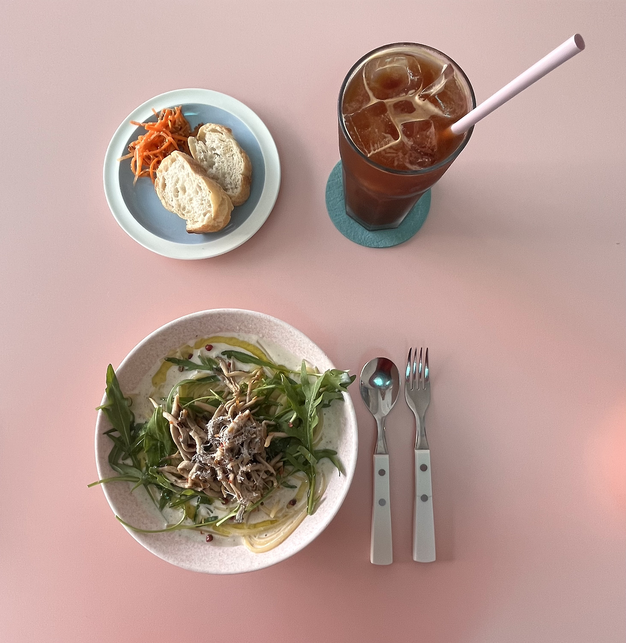 그렇게 주문한 음식은 버섯크림파스타와 아메리카노입니다. 남은 소스에 찍어 먹을 수 있는 바게트 두 조각과 당근라페도 곁들여 나왔습니다. 그 상차림을 보자마자 기분이 말랑말랑해지며 입맛이 화사하게 돌아 문득 “아, 색깔을 즐기는 음식도 있구나”하고 생각했습니다. 고작 한 사람을 위해 준비된 식탁에 무척이나 여러 가지 색이 있었습니다. 분홍색 테이블, 뽀얀 크림, 옅은 갈색의 버섯, 싱싱한 초록빛 루꼴라, 노랗게 발하는 파스타면, 주황색 당근라페, 따뜻하게 익은 노란빛 바게트... 그리고 그 음식들을 담은 알록달록한 무늬와 빛깔의 그릇과 코스터까지. 마치 소꿉장난을 하는 것처럼 정겨운 정취와 애교가 느껴졌습니다.