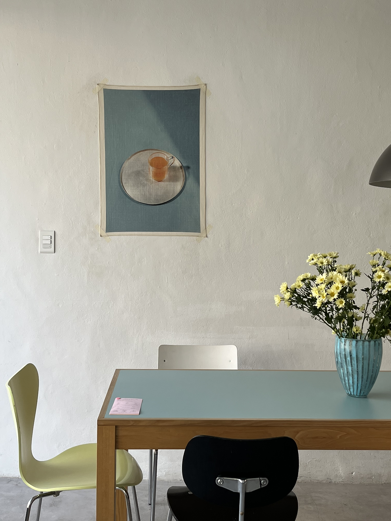 음식을 즐길 때 색을 즐긴다는 것은 일상이 귀여워지고 생기가 퐁퐁 솟는 유희가 아닐까요? 늘 봐 오던 흰색이나 원목 테이블이 아닌, 통통 튀는 색깔의 테이블을 두어 집 안에 포인트를 줄 수 있겠지요. 과감한 시도가 부담스럽다면 개성 넘치는 예쁜 그릇에 음식을 담아도 좋을 것입니다. 예쁜 색실로 두툼하게 짜인 티코스터를 컵 아래 깔기도 하고요.