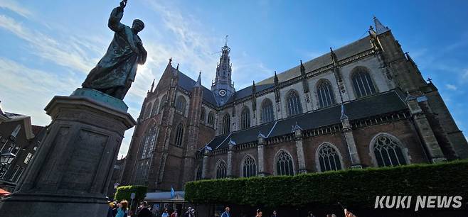 그로테 마르그트(Grote Markt) 광장의 성 바봉 교회, 동상은 인쇄술로 유명한 하를렘 출신의 로렌스 얀손 코스터(Laurens Janazoon Coster, 1370~1440)이다.