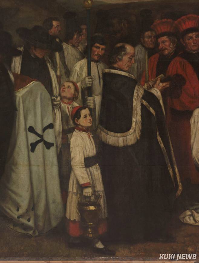 운구인들 옆에는 날카로운 눈초리로 관람자와 시선이 마주치는 십자가를 든 사람과 복사들이 있다. 앞에 선 소년은 향로를 들고, 다른 소년은 촛대를 들고 있는데 운구하는 남자와 눈을 마주치며 무척이나 지루한 모양이다.